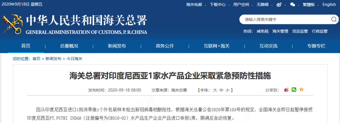 海关总署网站9月18日消息,因从印度尼西亚进口1批冻带鱼1个外包装样本检出新冠病毒核酸阳性,根据海关总署公告2020年第103号的规定,全国海关自即日起暂停接受印度尼西亚PT.PUTRI INDAH(注册编号为CR010-02)水产品生产企业产品进口申报1周,期满后自动恢复。