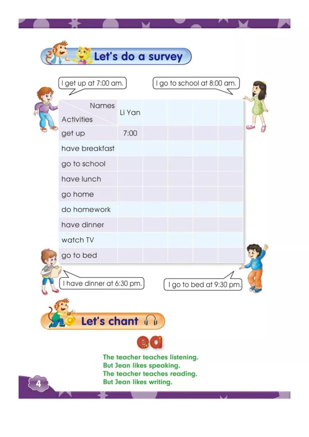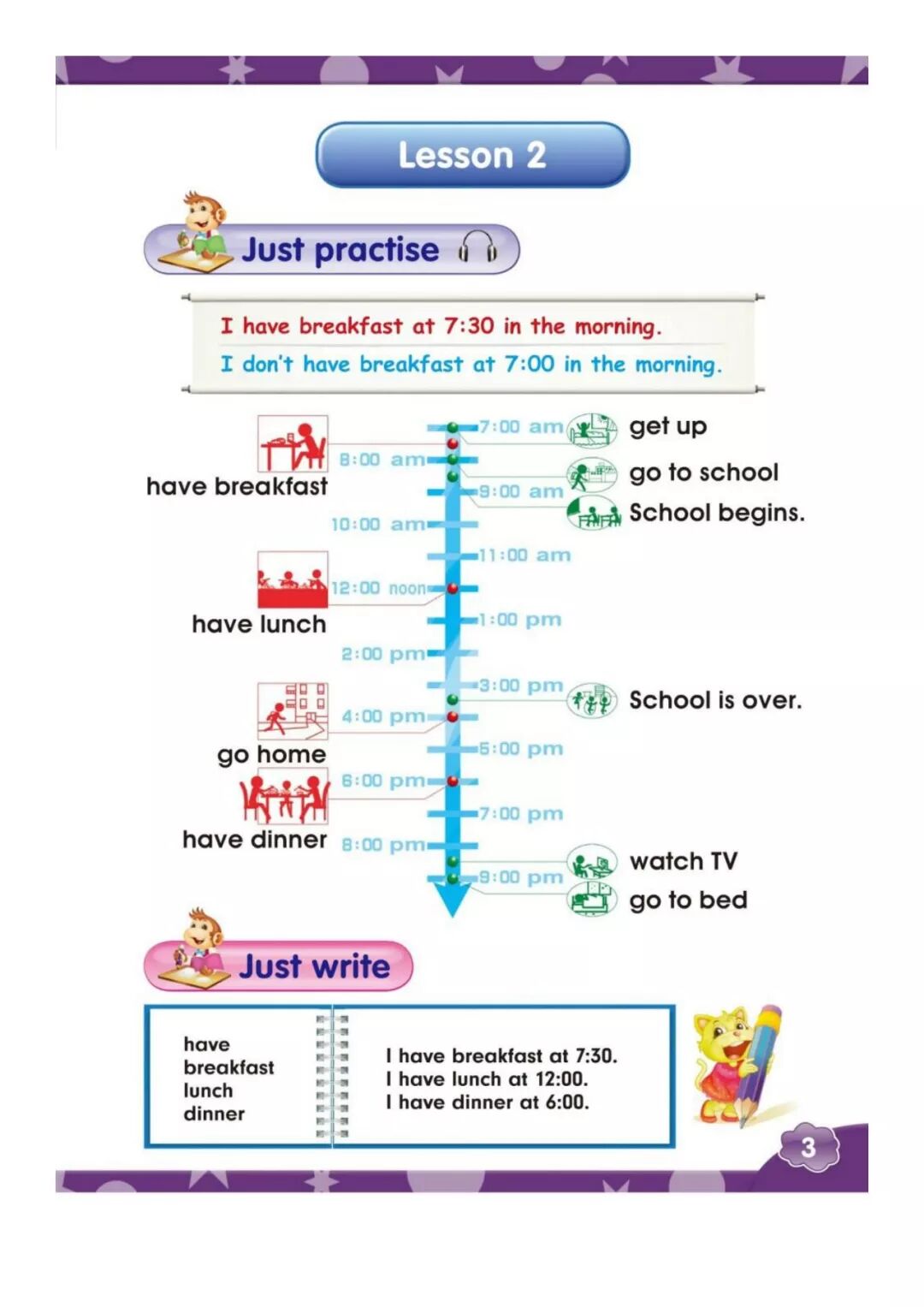 1.have breakfast , in the morning , don't , have lunch , have dinner ,go to bed