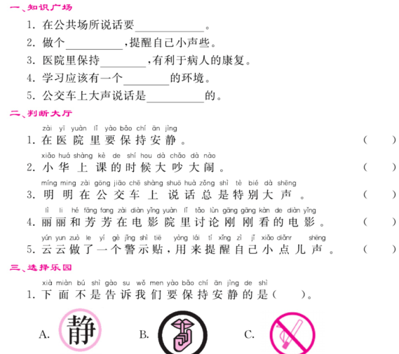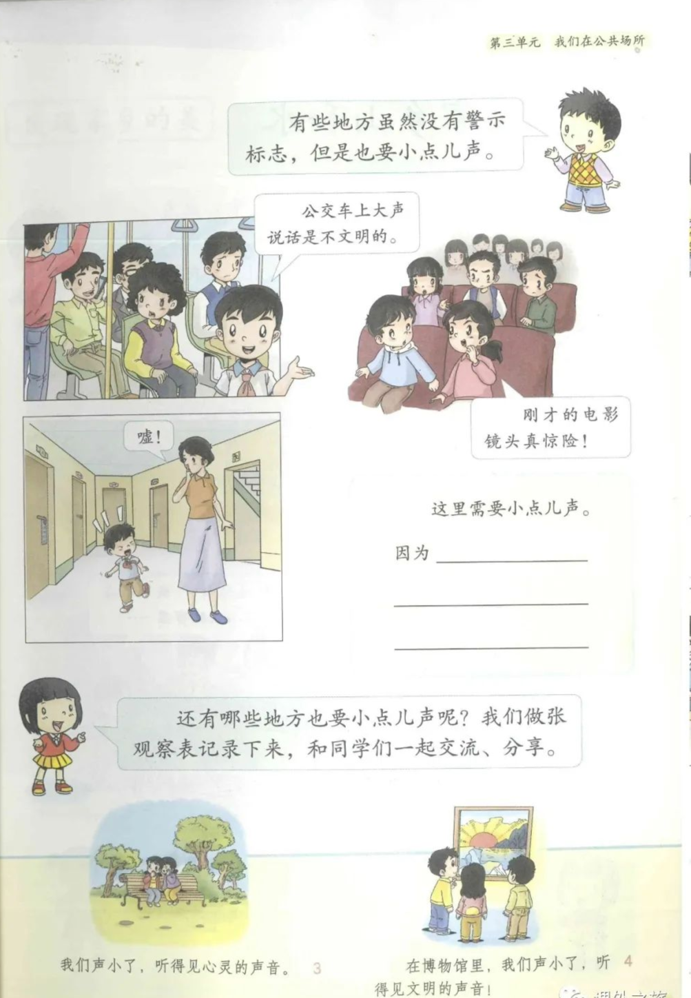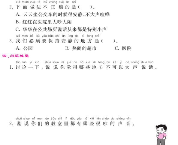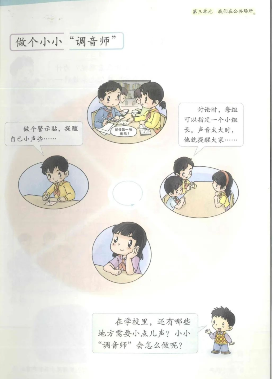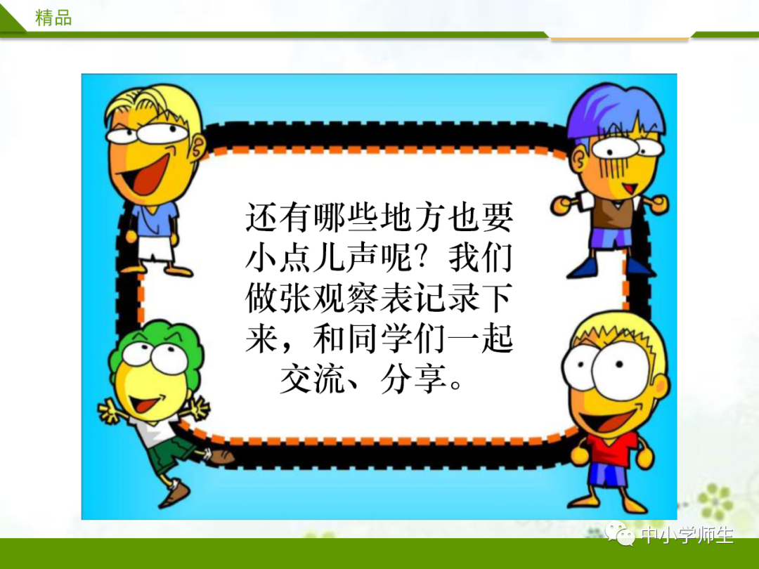 还有哪些地方也要小点声呢?我们做张观察表记录下来,和同学们一起交流、分享。