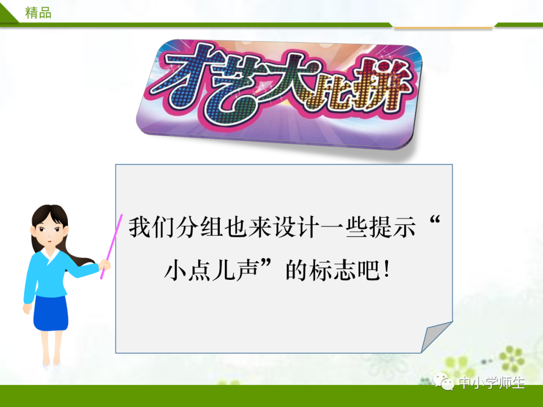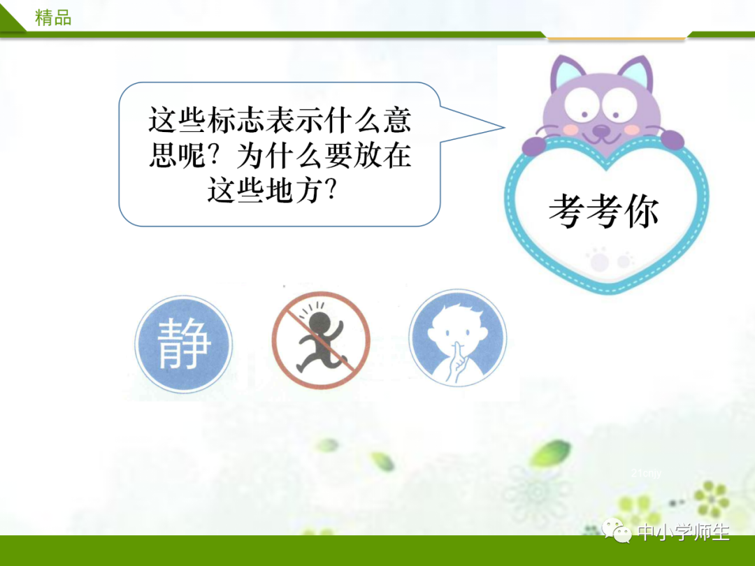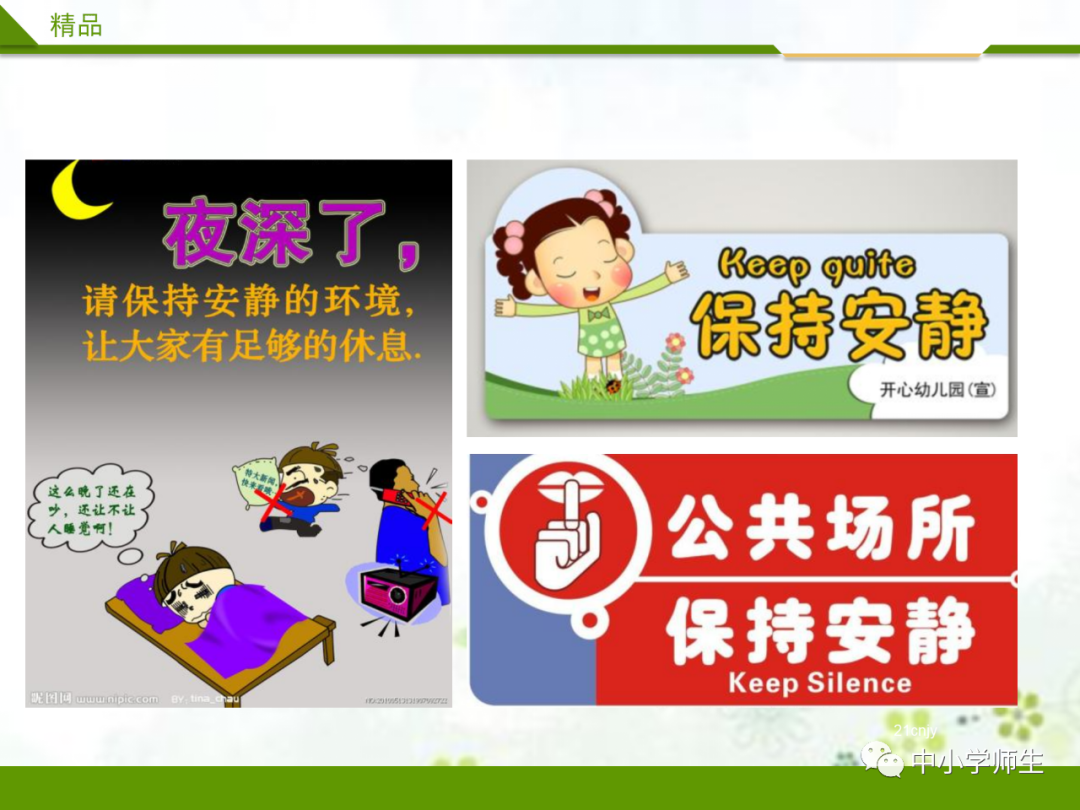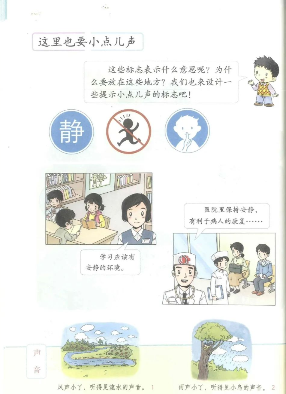 请生思考:这些标志表示什么意思呢?为什么要放在这些地方?我们也来设计一些提示小点儿声的标志吧!