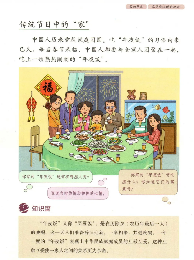 教师:你家的“年夜饭”通常有哪些人呢?说说当时的情形和你的心情。你家的“年夜饭”常吃些什么?你知道它们与家庭美好生活有什么关联吗?