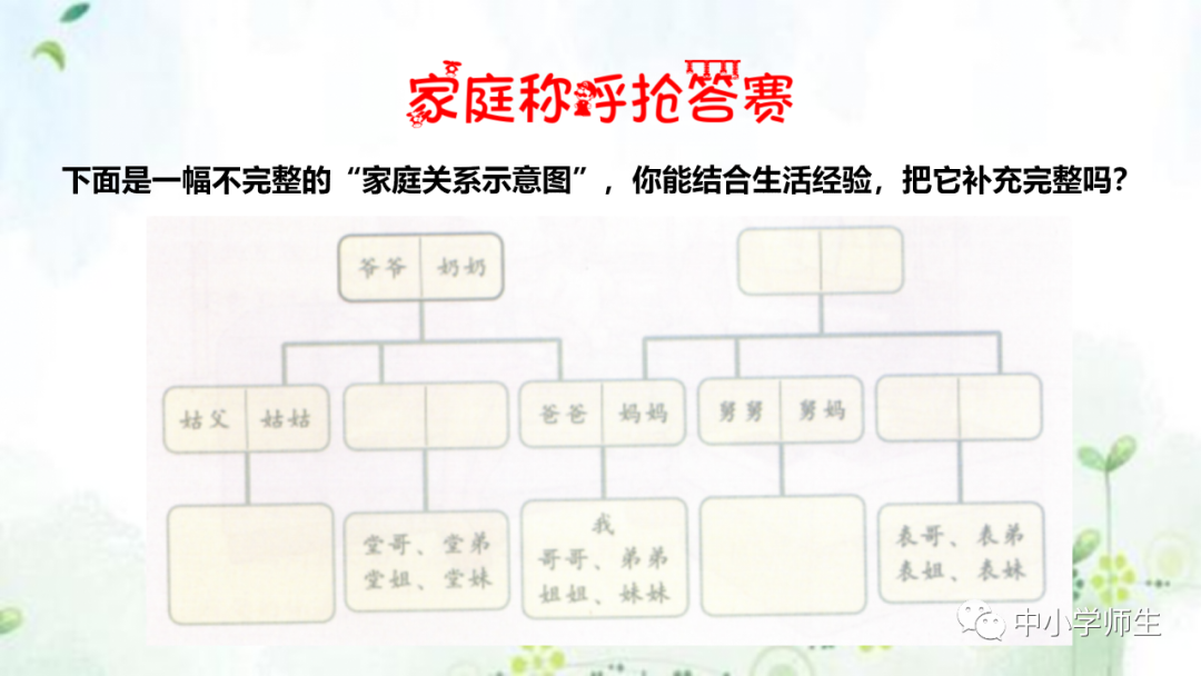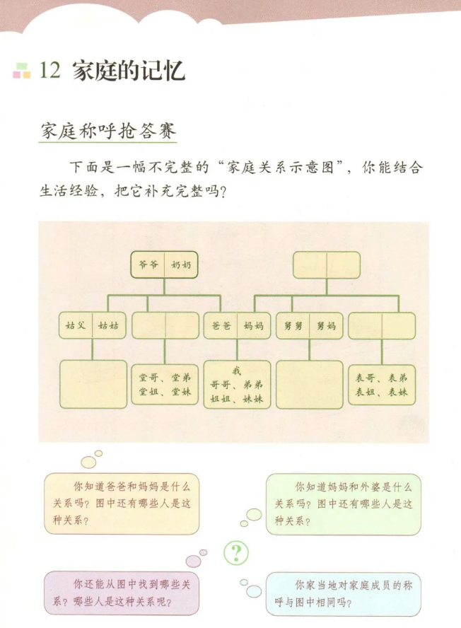 教学重点:了解家庭成员的称呼,知道家庭的发展变化,知道家庭的重要日子和事件。