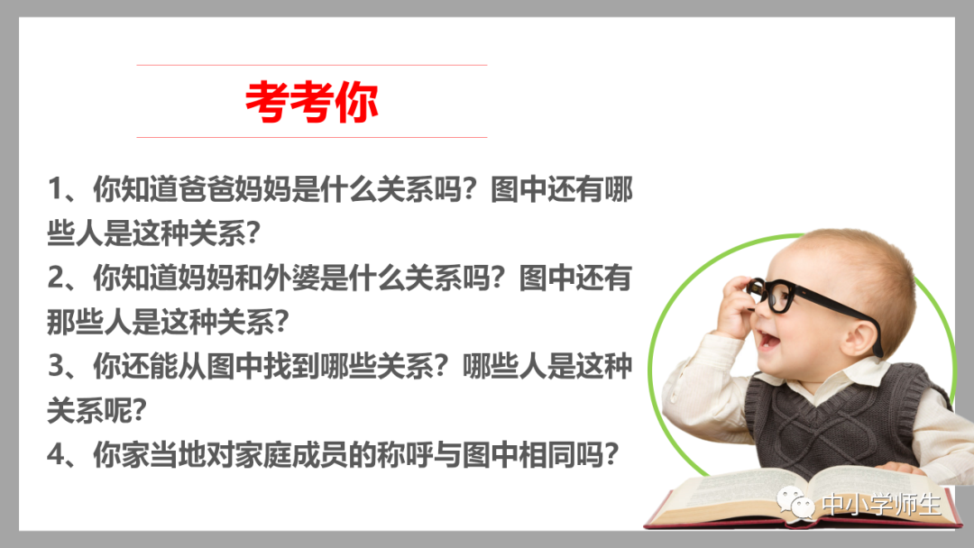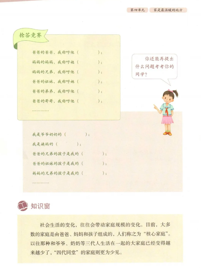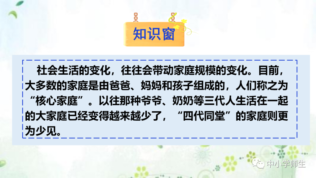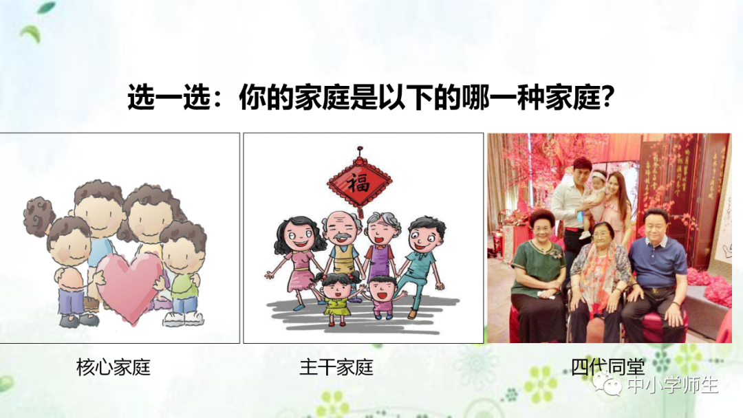 教师:社会生活的变化,往往会带动家庭规模的变化。目前,大多数的家庭是由爸爸、妈妈和孩子组成的,人们称之为“核心家庭”。以往那种和爷谷、奶奶等三代人生活在一一起的大家庭已经变得越来越少了,“四代同堂”的家庭则更为少见。