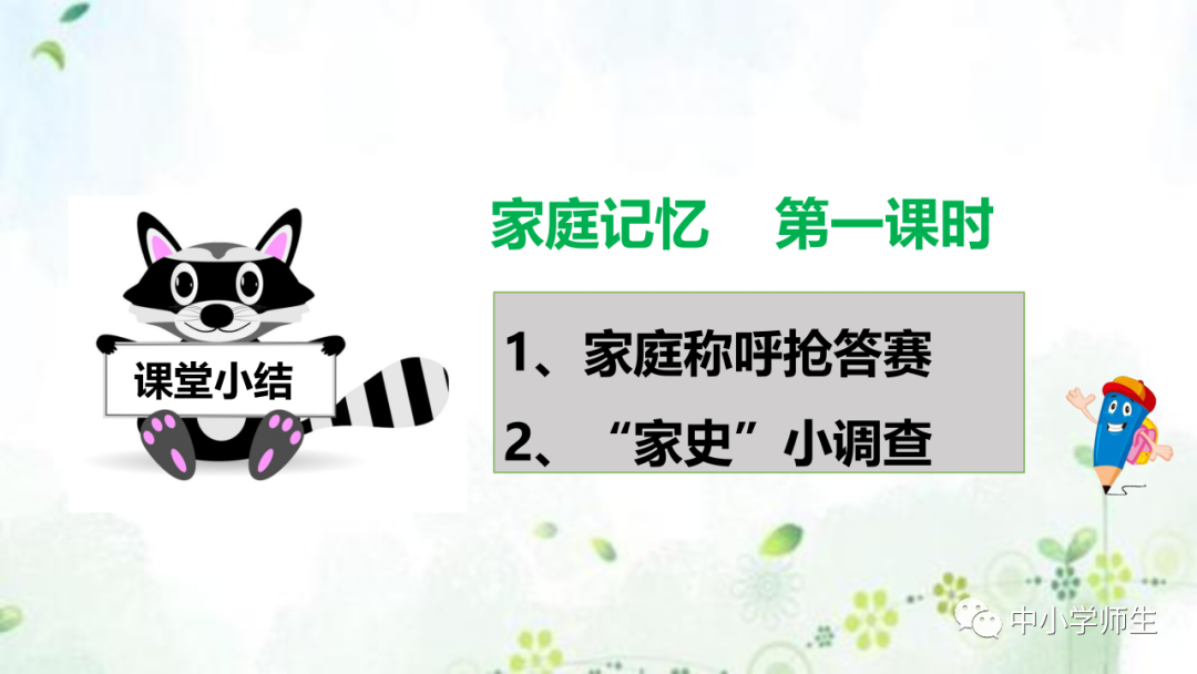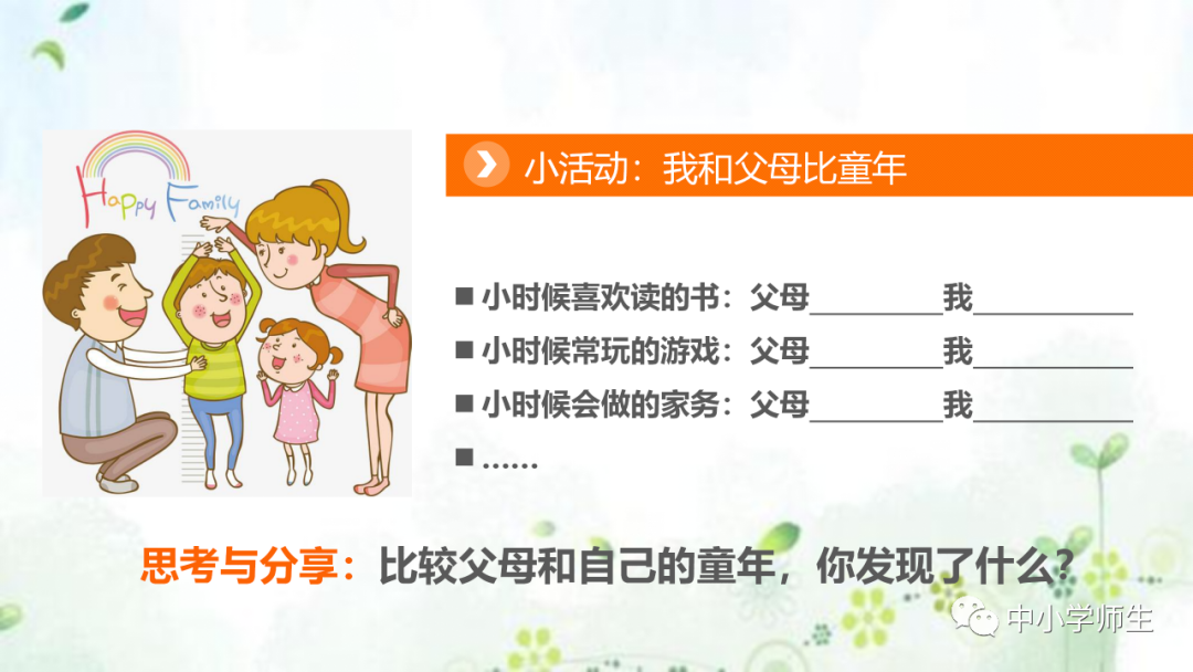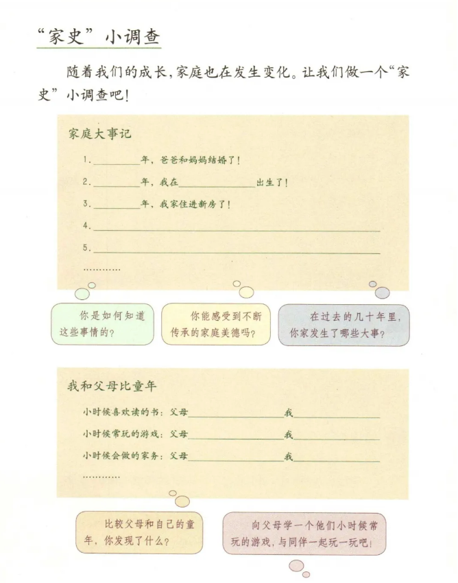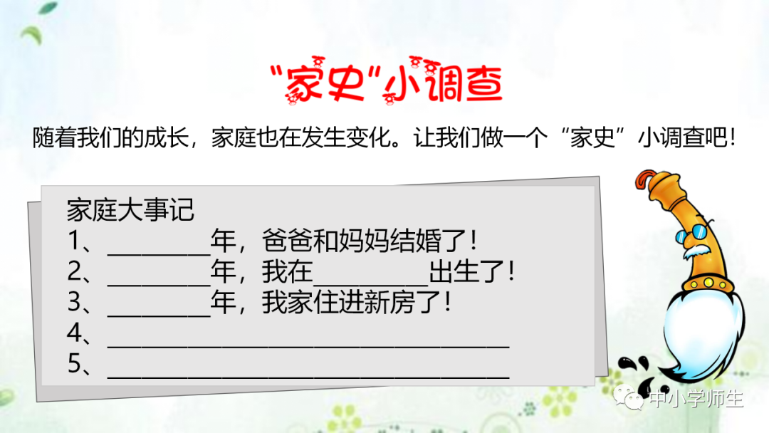 教师:随着我们的成长,家庭也在发生变化。让我们做一个“家史”小调查吧!