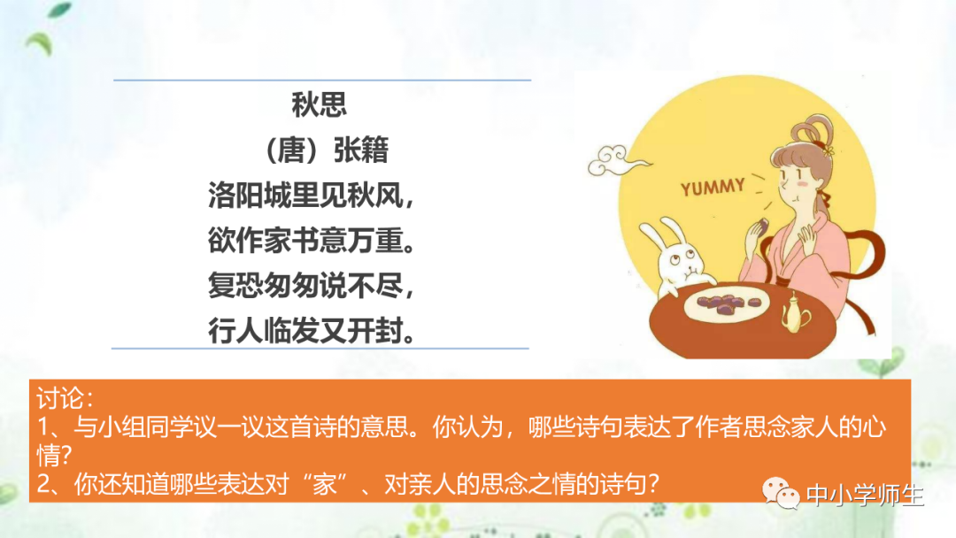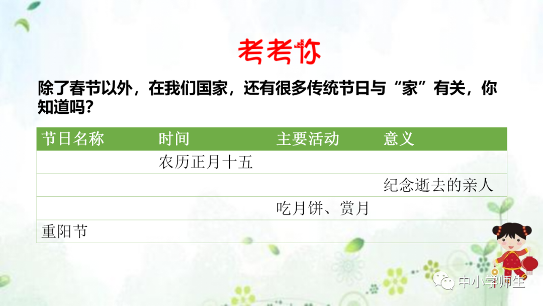 教师:除了春节以外,在我们国家,还有很多传统节日与“家”有关,你知道吗?
