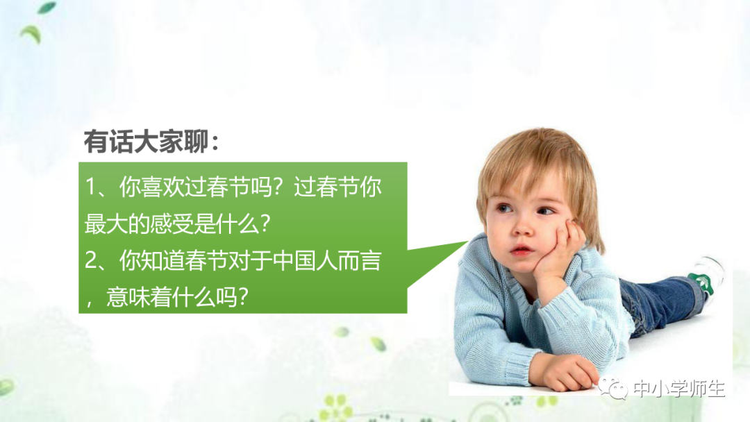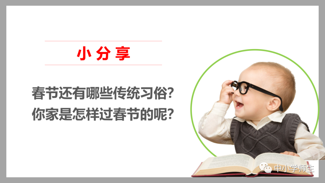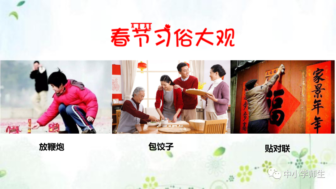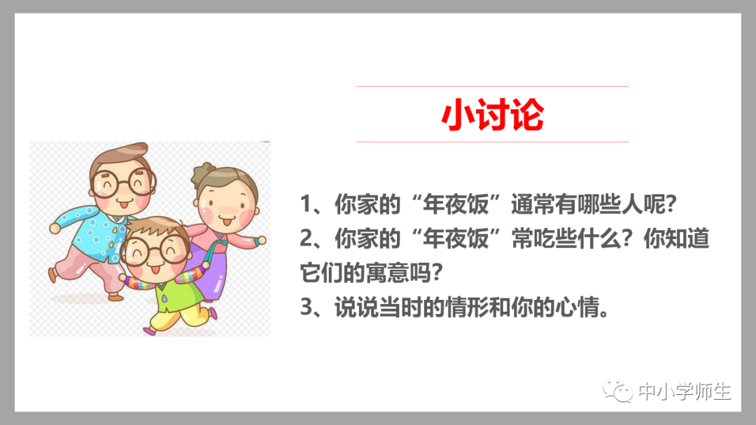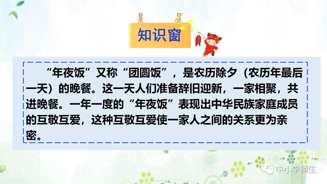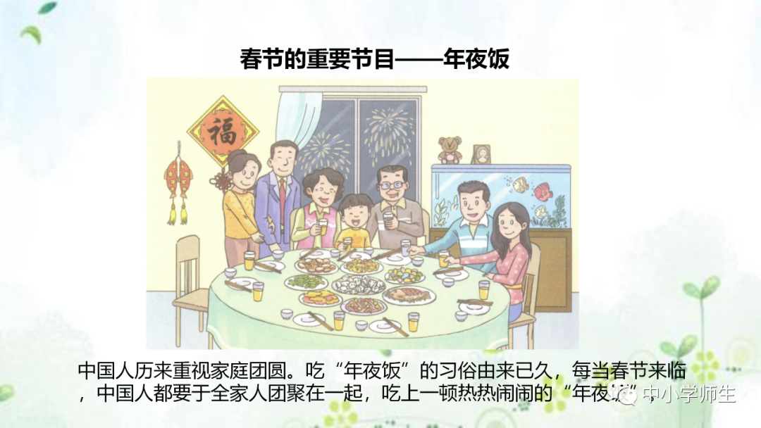 教师:每当春节来临,我们都会全家人聚在一起吃“年夜饭”。大家知道“年夜饭”的由来吗?
