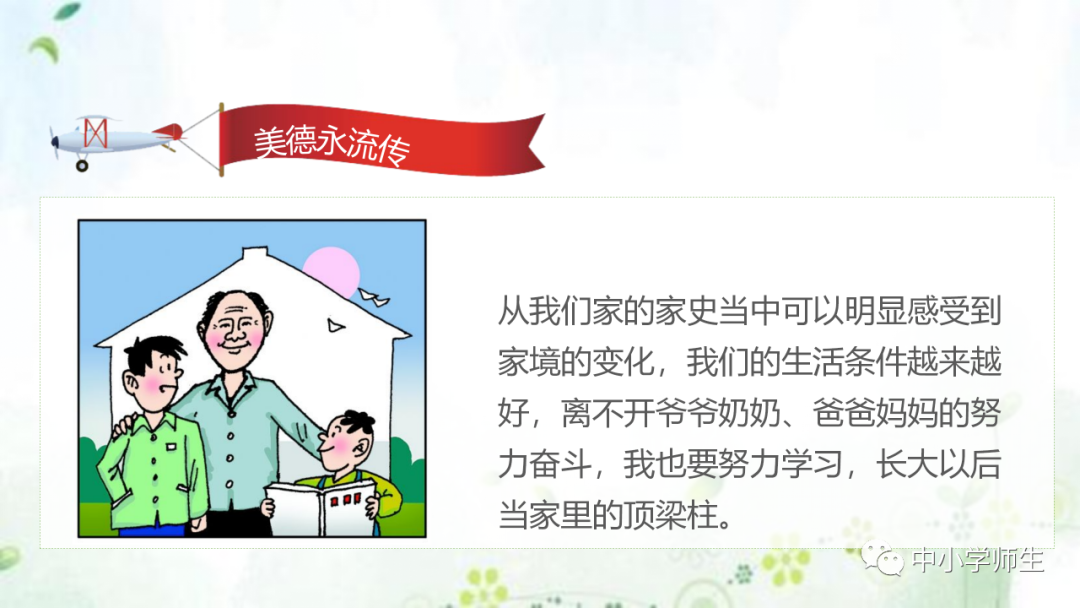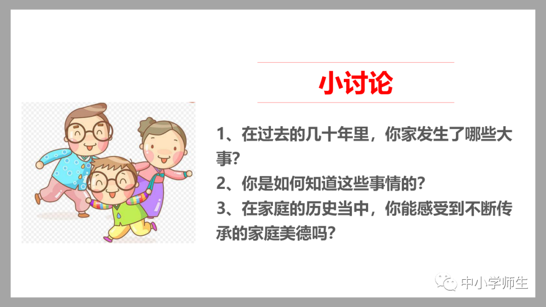 教师:你是如何知道这些事情的?你能感受到不断传承的家庭美德吗?在过去的几十年,你家发生了哪些大事?