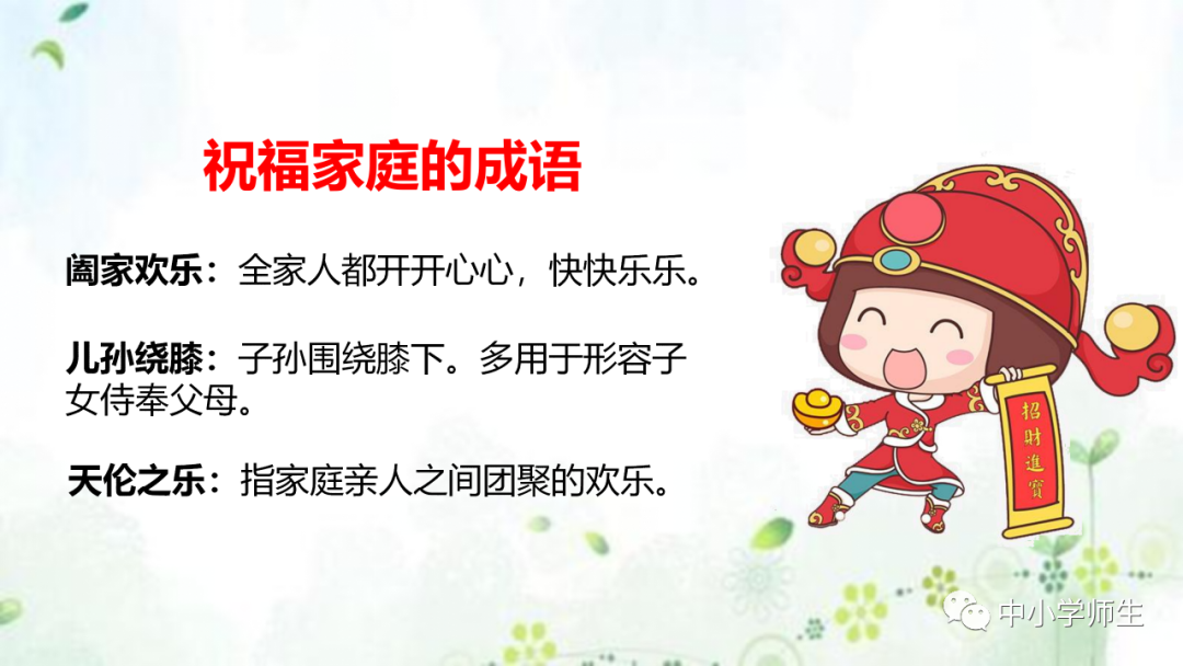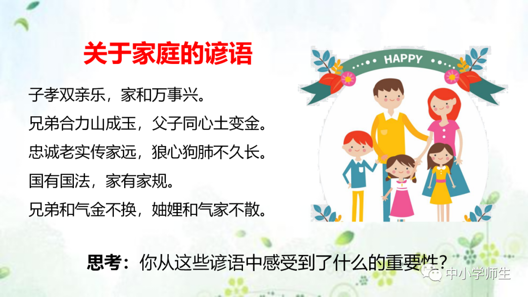 教师:你知道哪些祝福家庭的词语和谚语吗?通过这些成语和谚语,你发现中国人最重视什么呢?