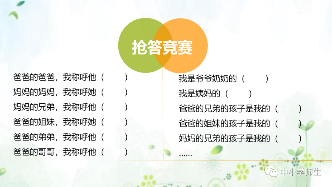 1、爸爸的爸爸是我的( );爸爸的哥哥是我的( );我是奶奶的( );我是叔叔(姑姑)的( );妈妈的妈妈是我的( );妈妈的姐姐(妹妹)是我的( );我是外公的( )。我是妈妈的姐姐的( );妈妈的姐妹的孩子是我的( )。