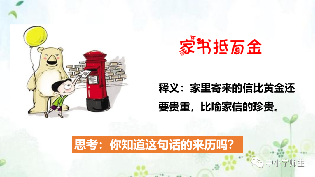 2、“家书抵万金”是指家里寄来的信比黄金还要贵重,比喻家新的珍贵。( )