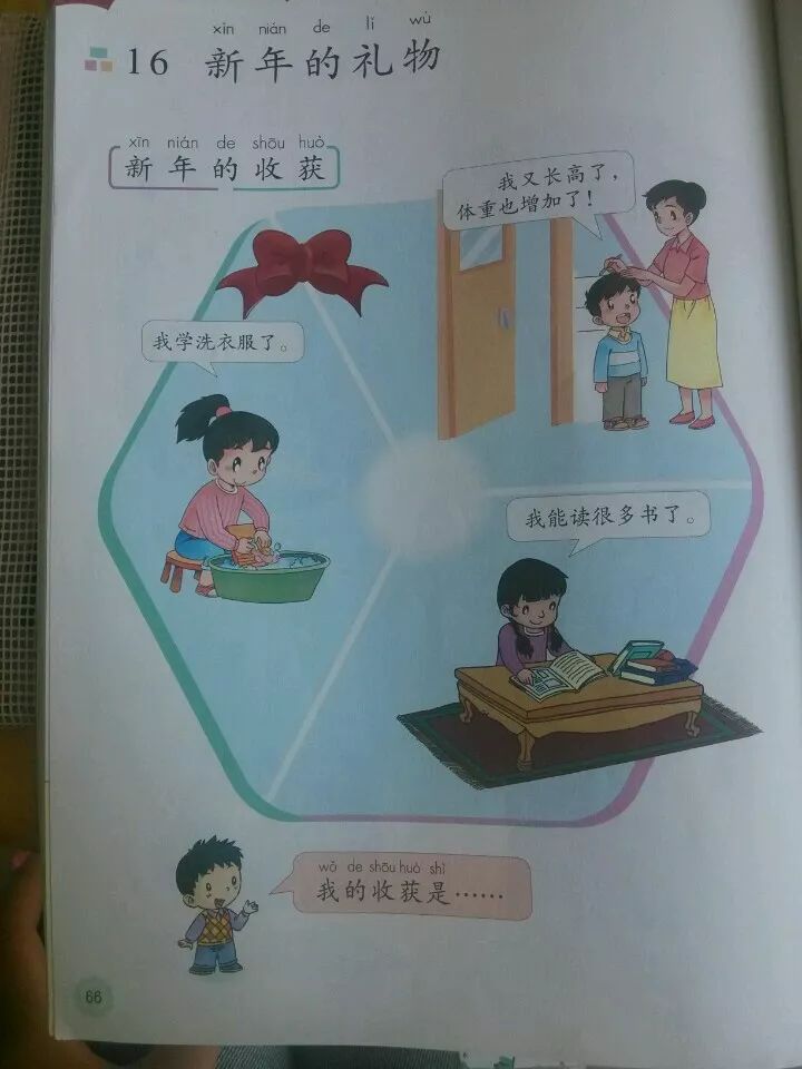 师:在我们家长和老师的眼里,你们进步了很多很多,从不知道怎么听课到现在能坐定在椅子上35分钟,小眼睛看着老师、听着老师讲课;从不知道怎么做作业到现在能写端端正正的字;从不会整理书包、书柜到现在能按老师要求去自己试着做并做好;从以前一不高兴就冲着爸爸妈妈、爷爷奶奶发脾气到现在懂得尊敬长辈了,从什么事都要家长帮忙到现在能帮家长做事了等等,这些都说明你们进步了、懂事了。你们喜欢老师给你们带来的新年礼物吗?