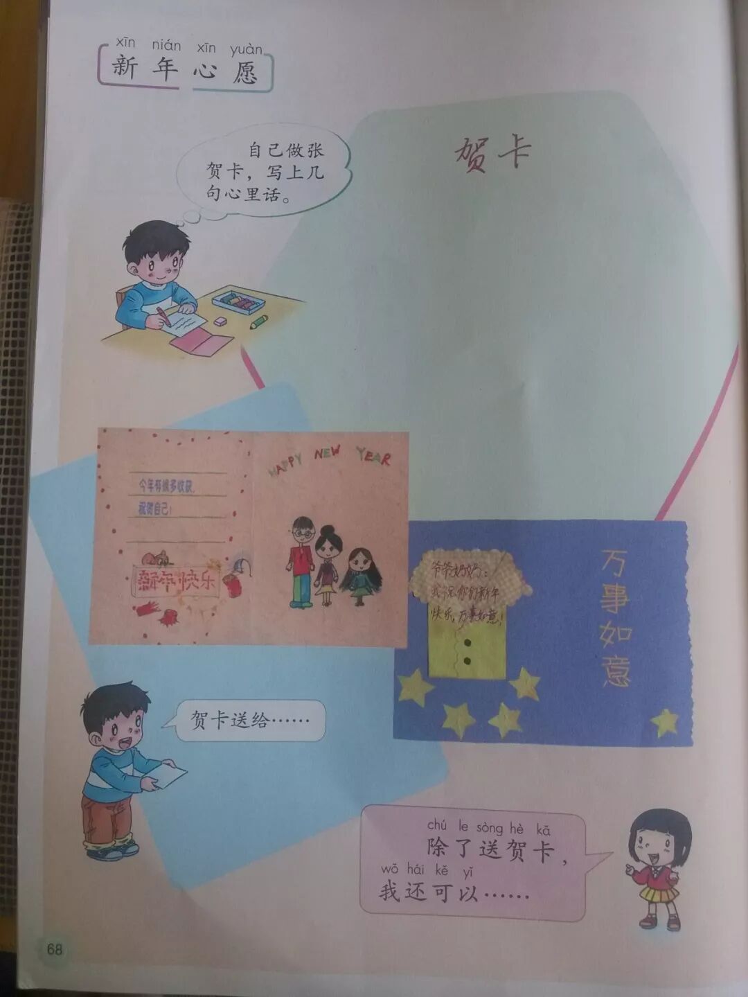 师:同学们,新年即将来到,上节课布置同学们回去自己动手制作一张“新年贺卡”,现在我们来各自欣赏一下。