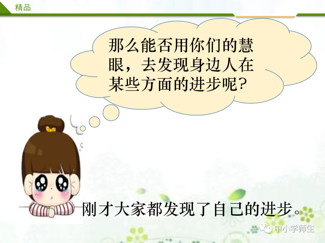 1、通过鼓励学生主动了解自己进步的情况,接受别人对自己的客观评价,正确看待自己的优缺点,激发学生的自信心,培养学生真诚虚心和积极进取的情感和态度。