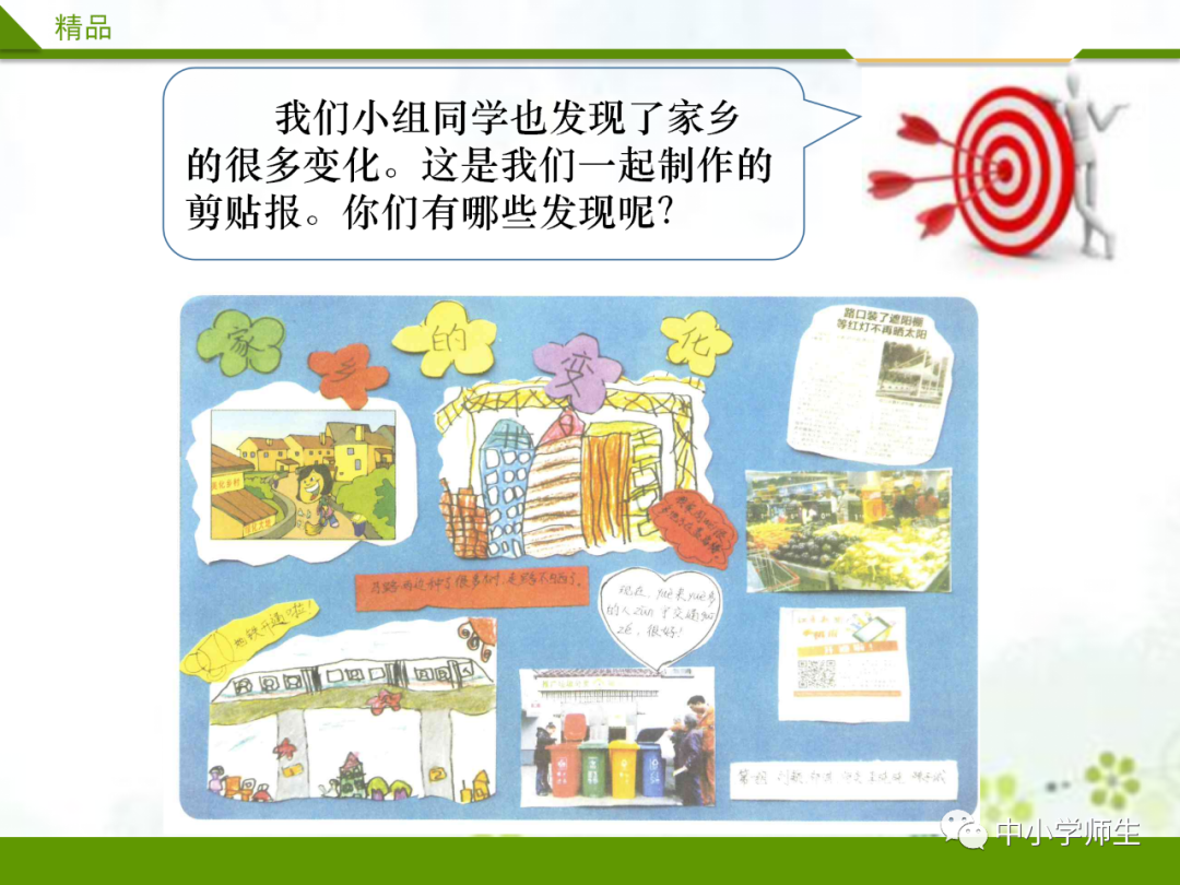 老师:我们的家乡正在发生着巨大的变化:城市街道改头换面;休闲锻炼人人爱;郊区荒地旧貌换新颜;祭祖方式现代化、 环保化 ,, 下面我们大家可以把你们在调查中搜集的图片、资料制作成“家乡变化”剪贴报展示给大家。