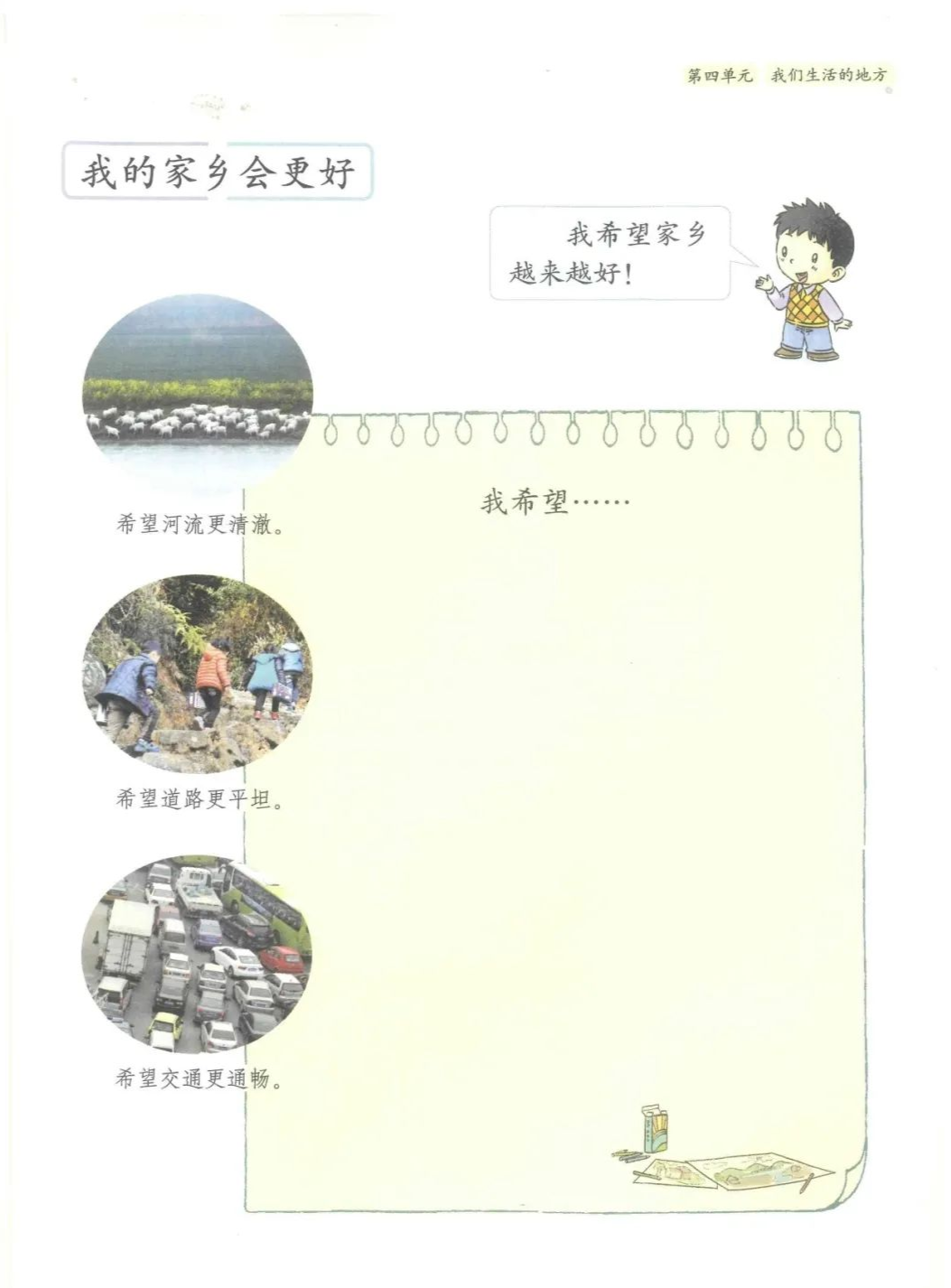 3、我希望家乡(越来越好)。我希望河流(更清澈)。我希望道路(更平坦)。