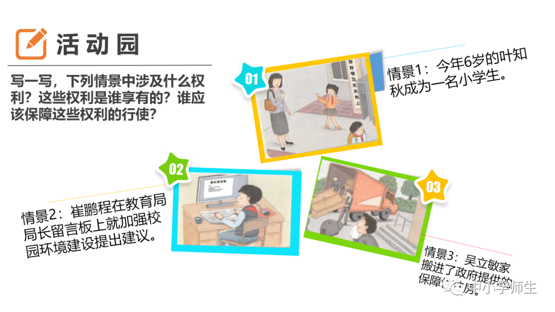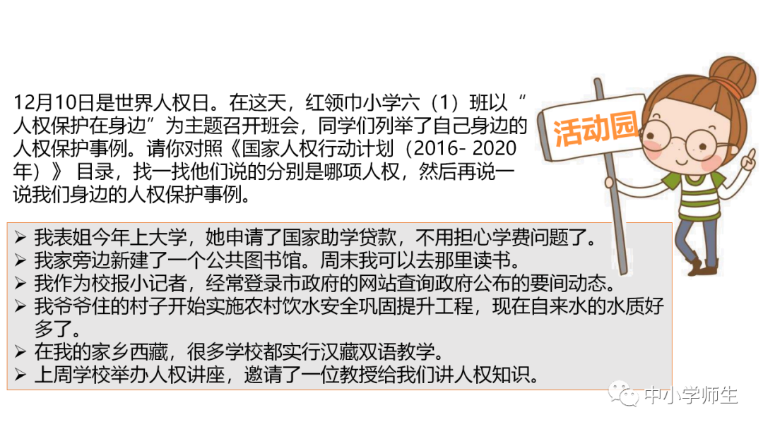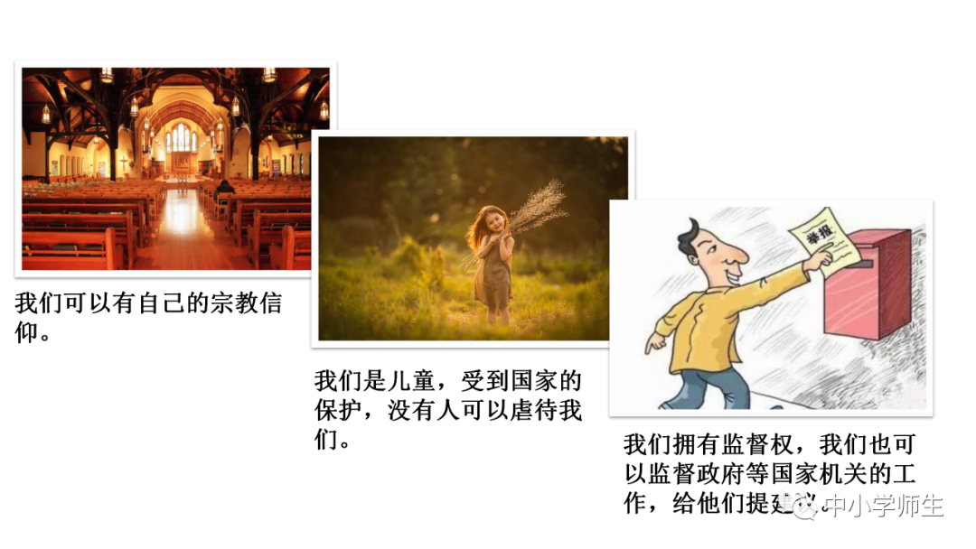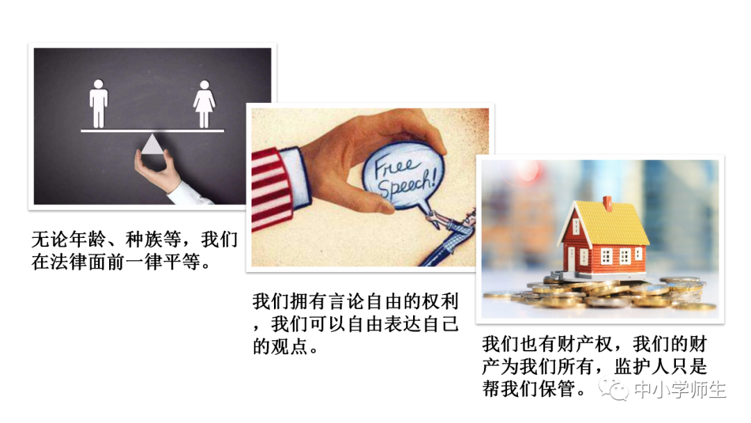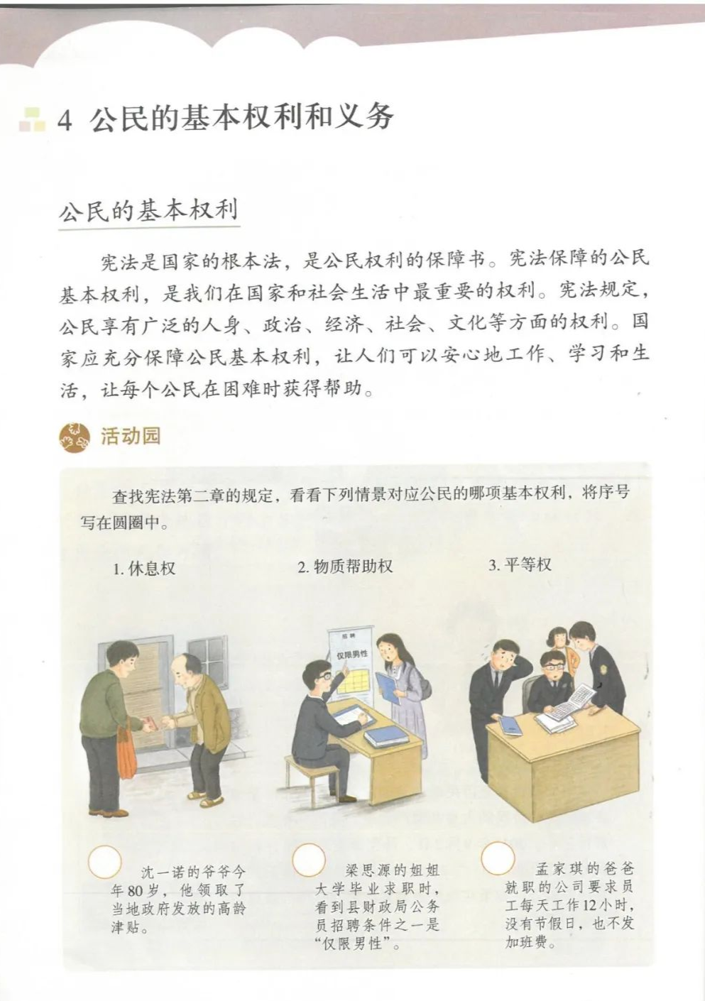 四、连线:权利:领取高龄补贴 人身自由 参加选举受教育