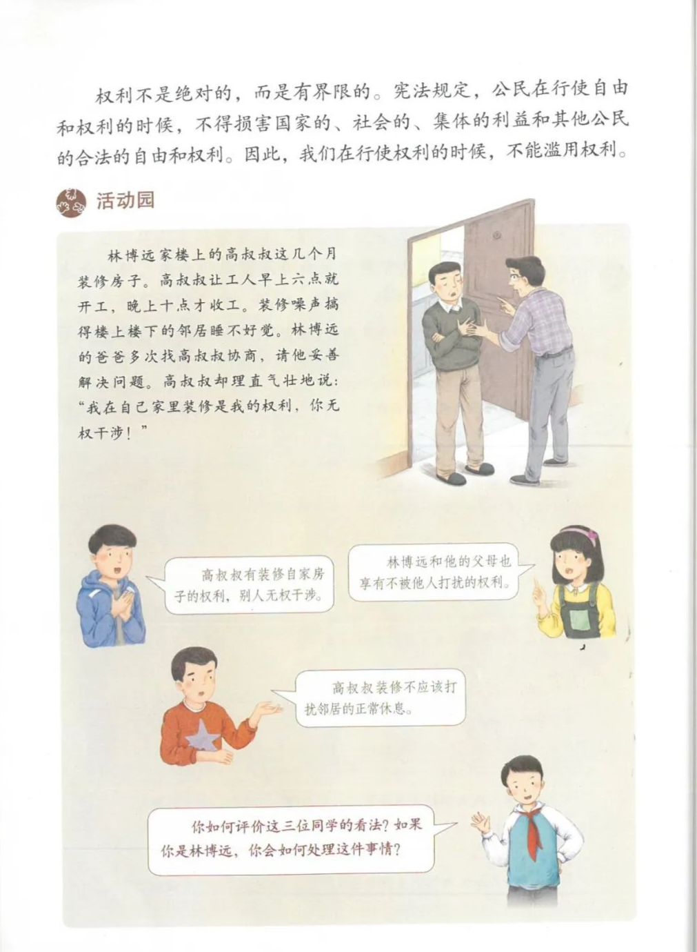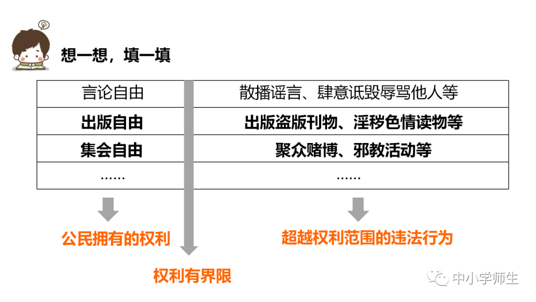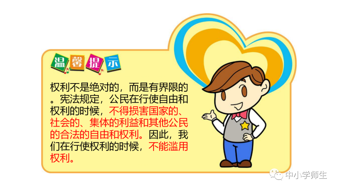 12.权利不是绝对的,而是有(界限)的。宪法规定,公民在行使自由和权利的时候,不得(损害)国家的、社会的、集体的利益和其他公民的合法的自由和权利。因此,我们在行使权利的时候,不能(滥用权力)。