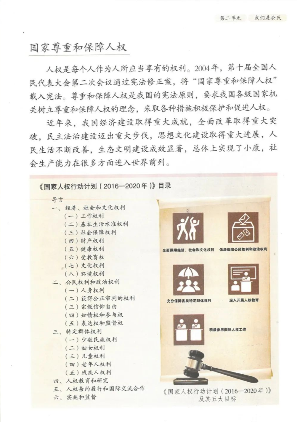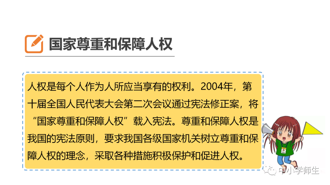 16.国家尊重和保障人权。人权是每个人作为人所应当享有的(权利)。(2004)年第十届全国人民代表大会第二次会议通过宪法修正案,将(“国家尊重和保障人权”)载入宪法。尊重和保障人权是我国的宪法原则,要求我国各级国家机关(树立)尊重和保障人权的观念,采取各种措施积极保护和促进人权。