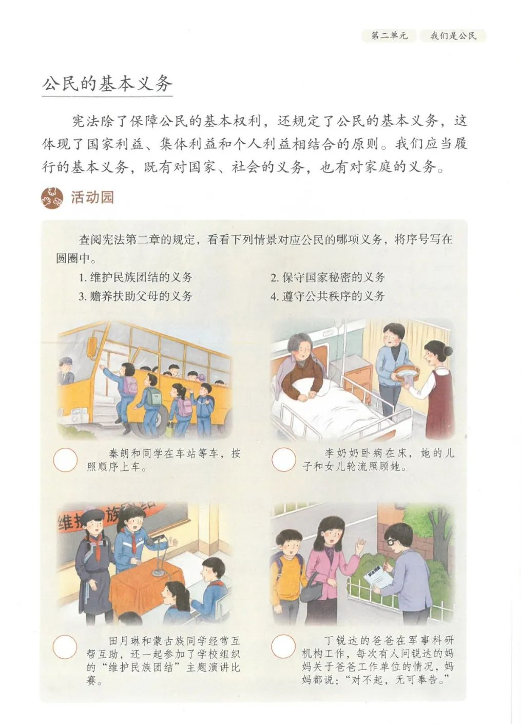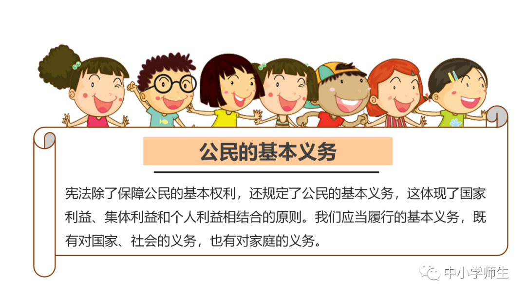 13.宪法除了保障公民基本权利,还规定了公民的基本(义务),这体现了国家利益、集体利益和(个人)利益相结合的原则。我们应当履行的基本义务,既有对国家、社会的义务,也有对(家庭)的义务。
