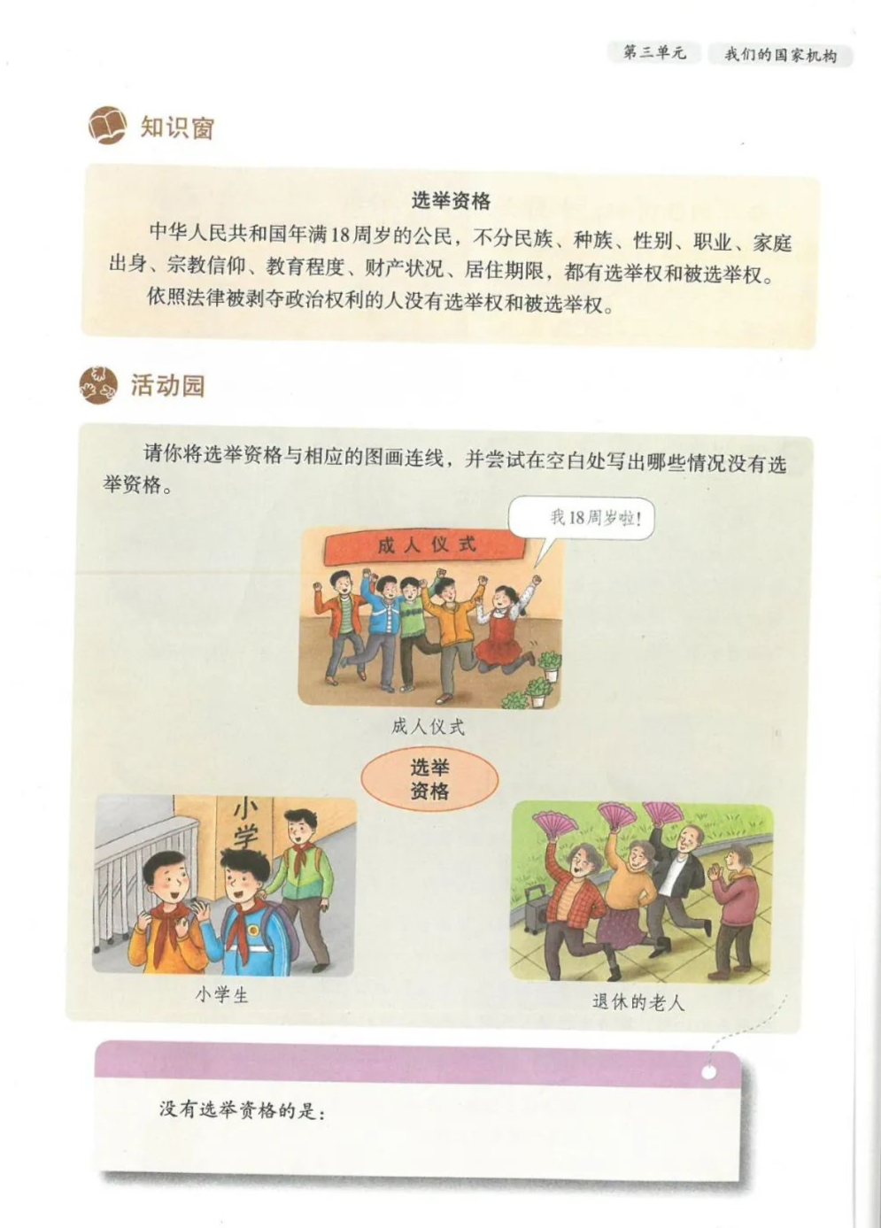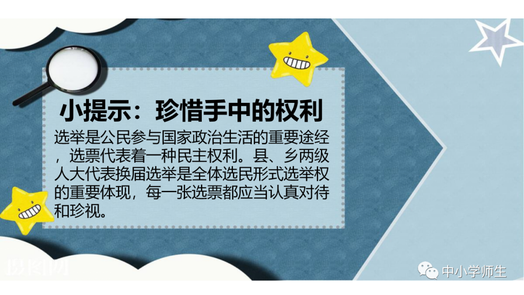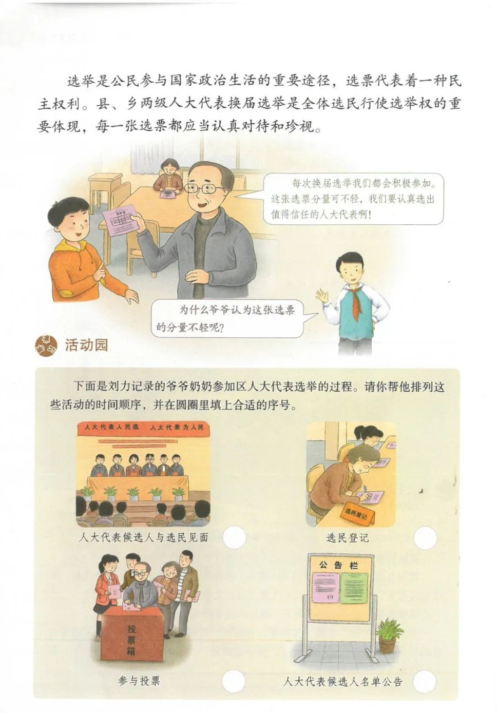 15.(选举)是公民参与国家政治生活的重要途径,(选票)代表着一种民主权利。县、乡两级人大代表换届选举是全体选民行使选举权重要体现,每一张选票都应当认真对待和珍视。