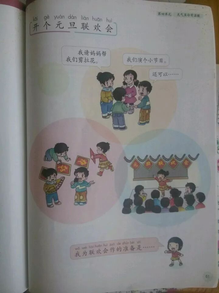 4看看书上的四幅图画的是什么?(舞狮子、耍龙灯、贴窗花、逛花市、张灯结彩)