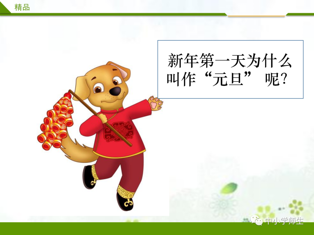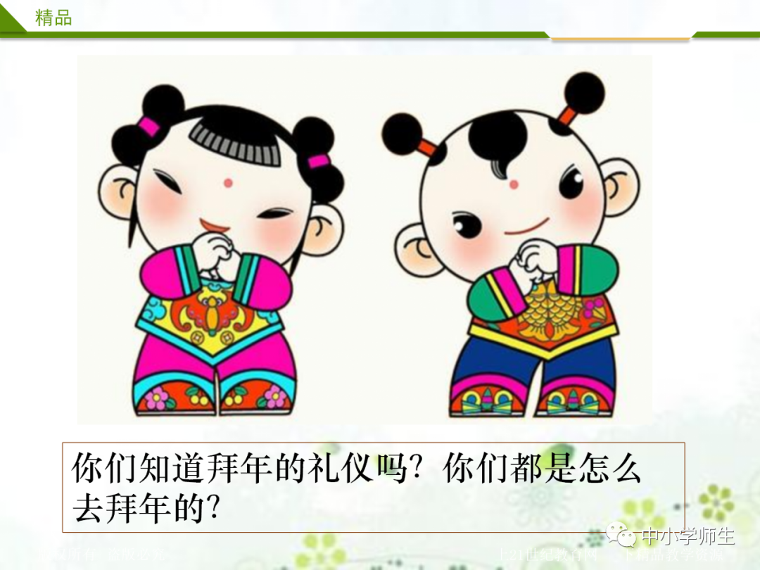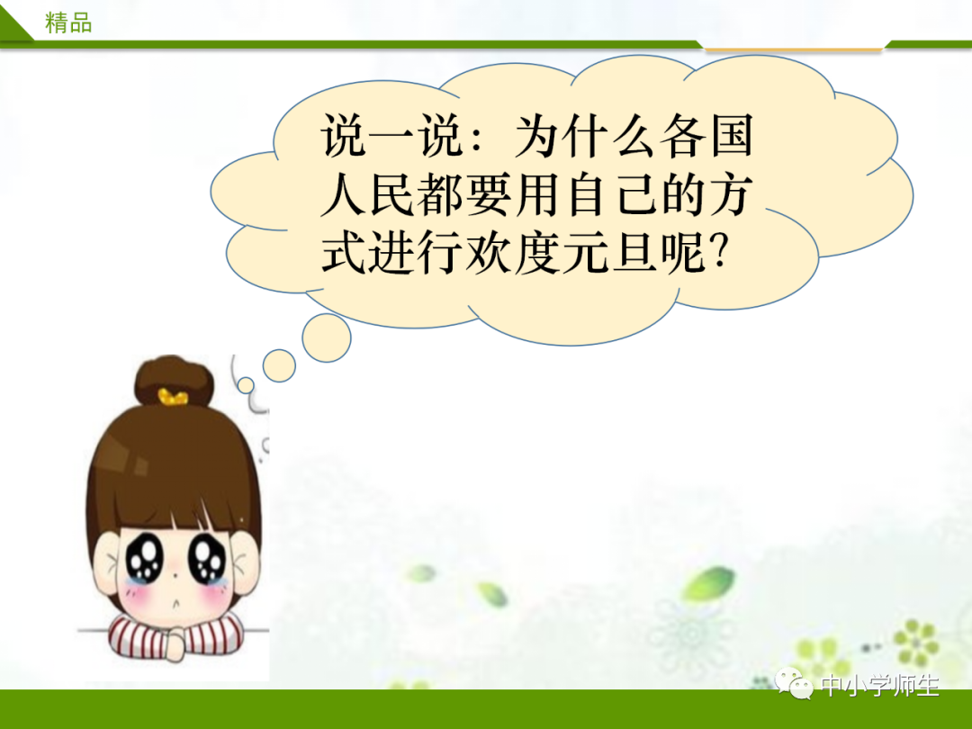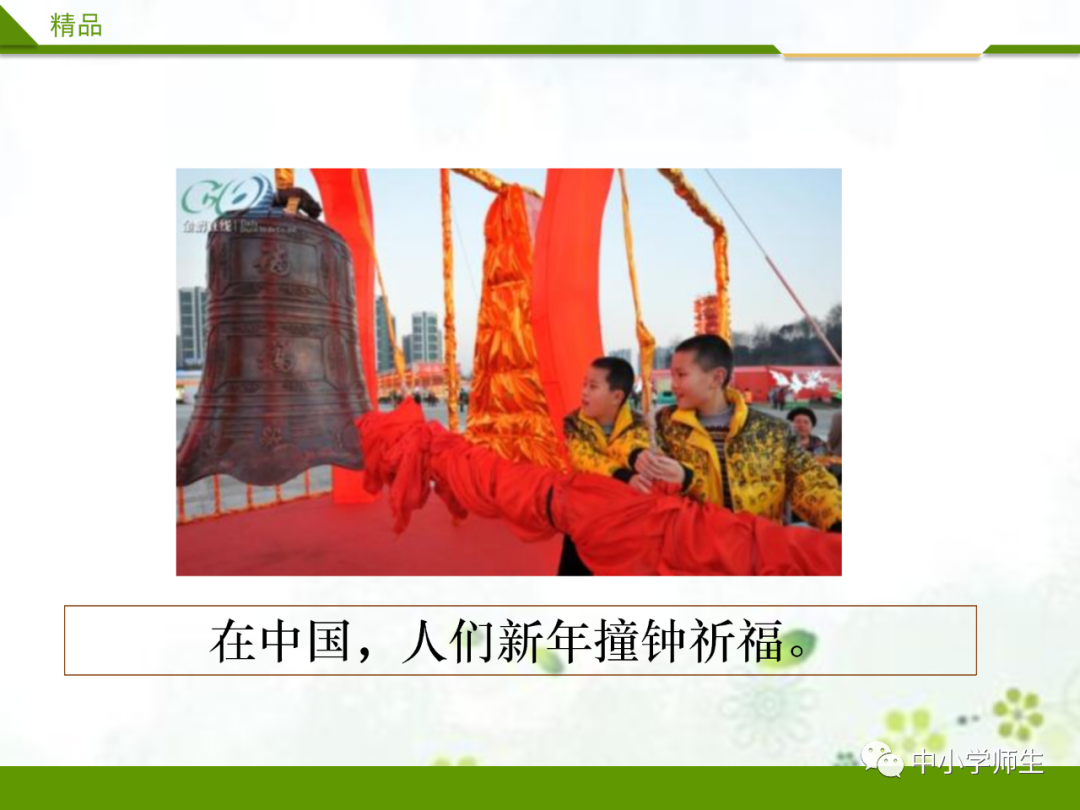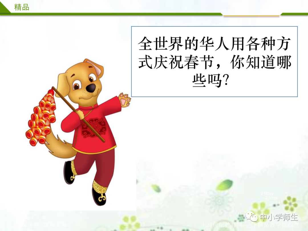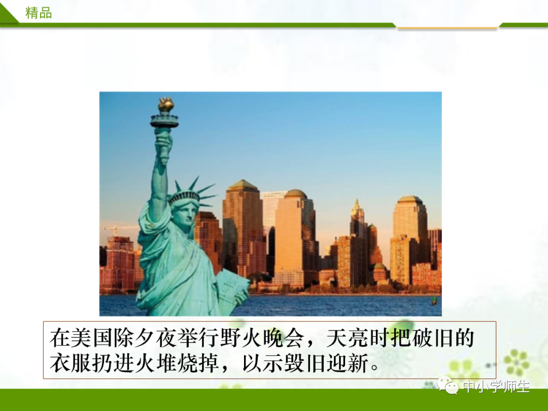 1师:春节是中国人的传统节日,是按照传统的农历的正月初一为新一年的开始,别的民族、别的国家也有自己传统的新年,你能说出一两个吗?