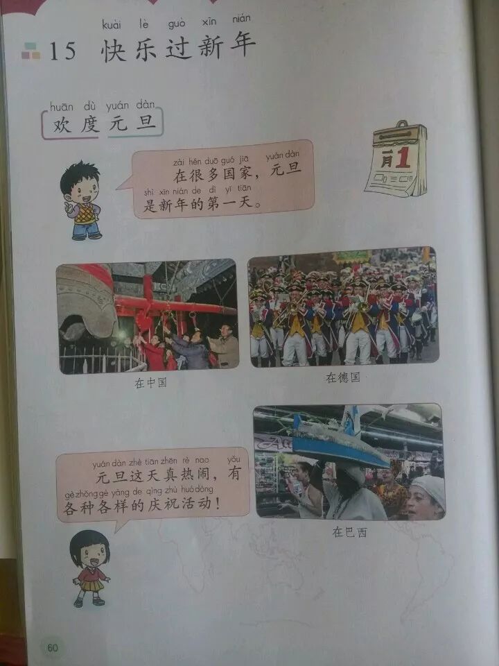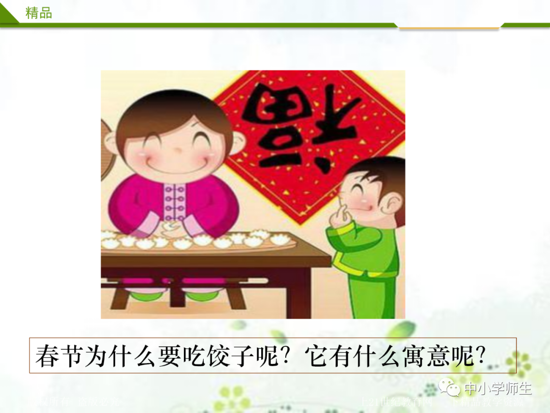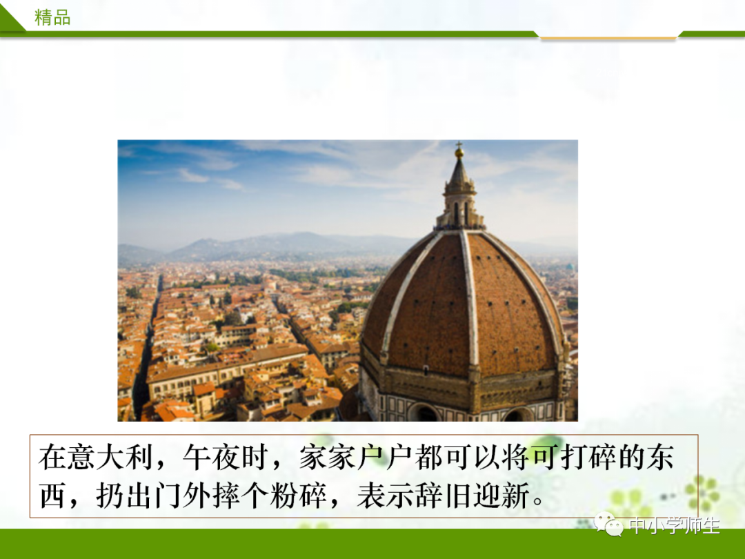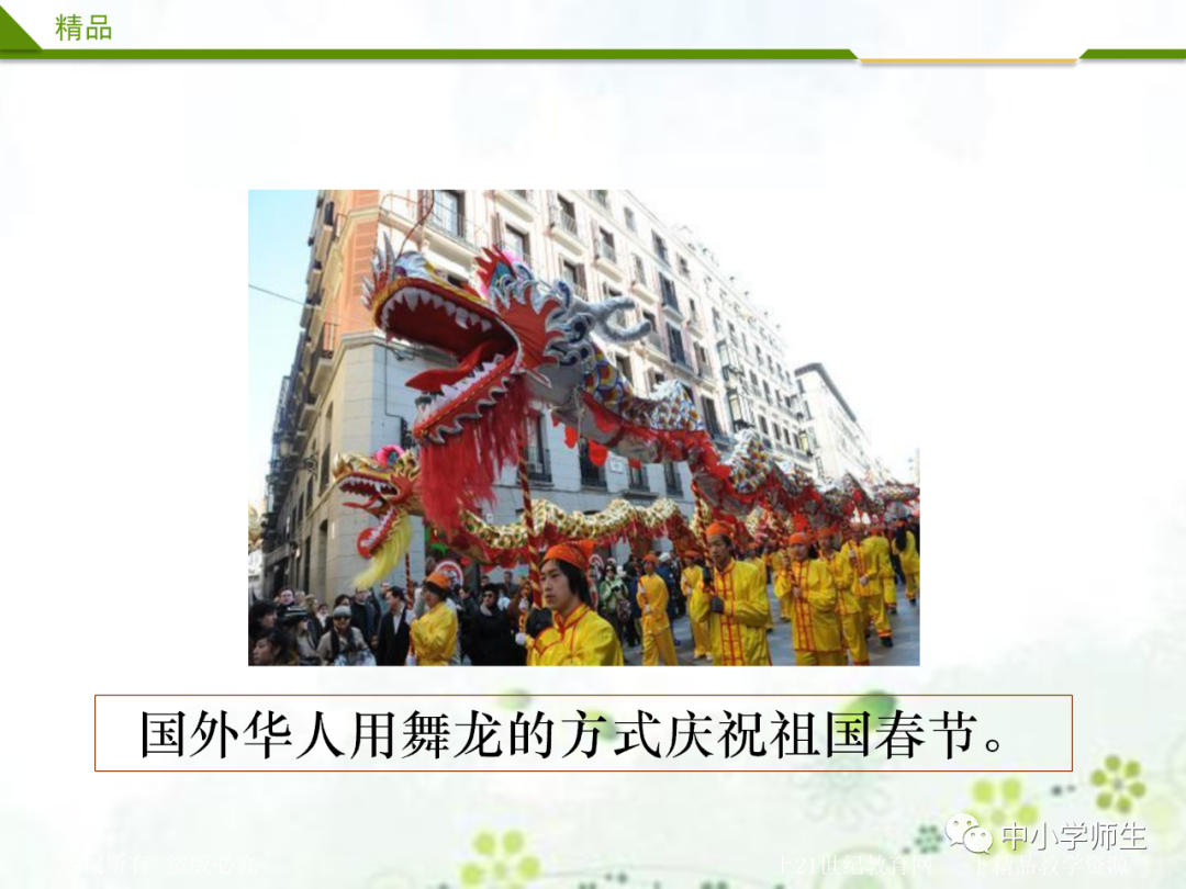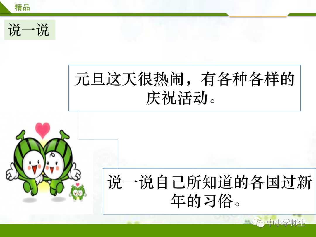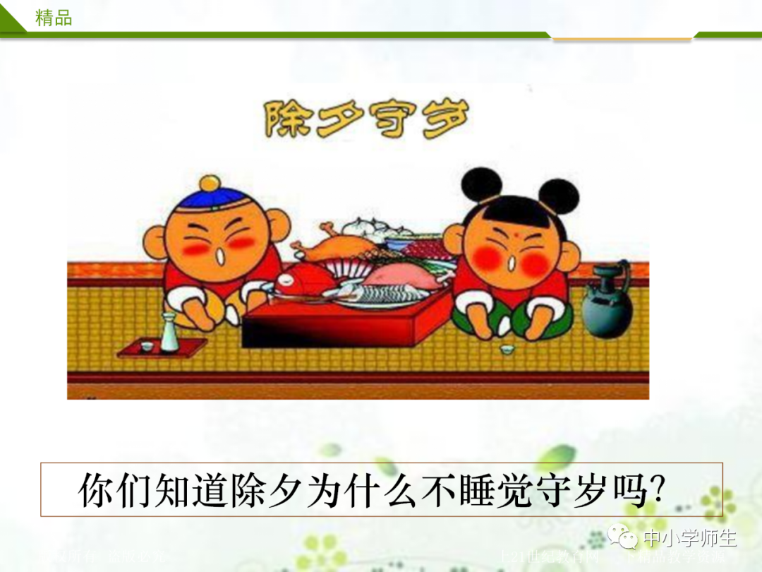 1师:春节是中国人的传统节日,是按照传统的农历的正月初一为新一年的开始,别的民族、别的国家也有自己传统的新年,你能说出一两个吗?