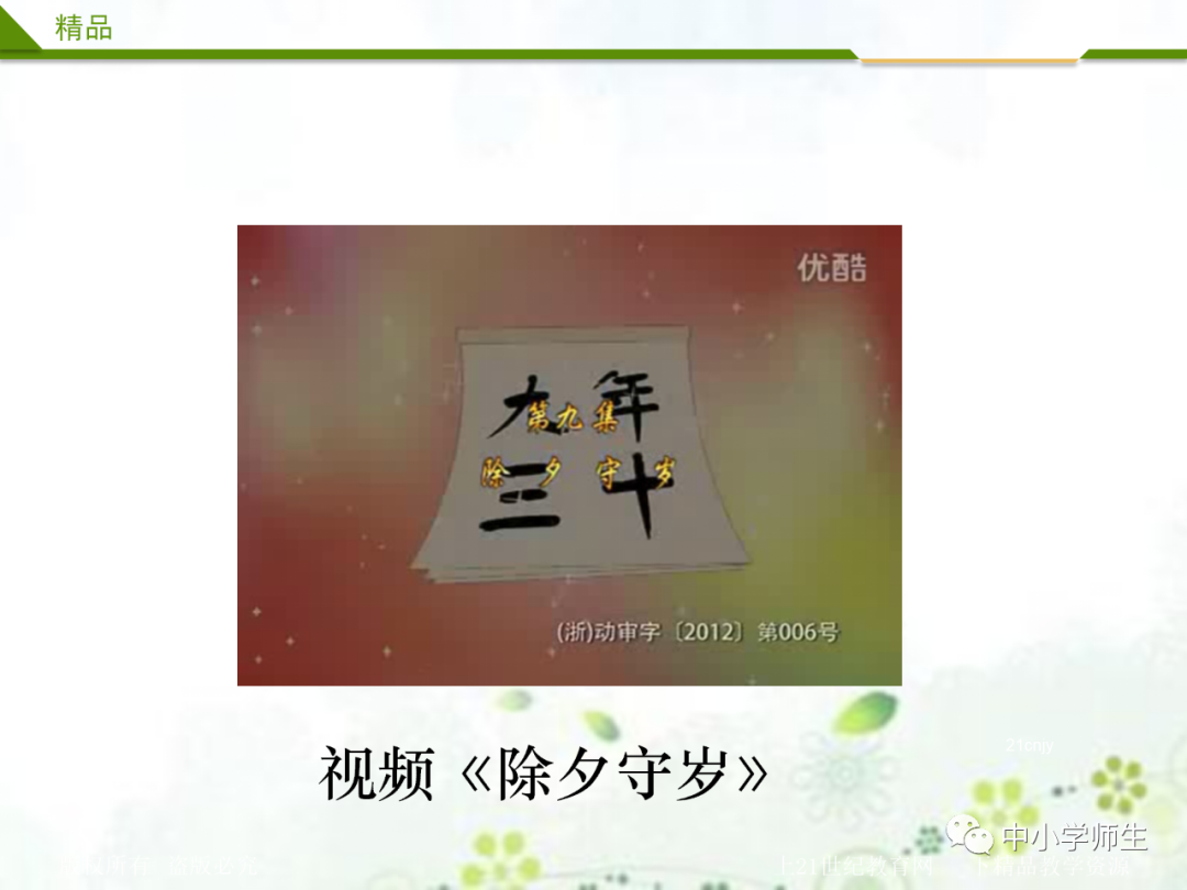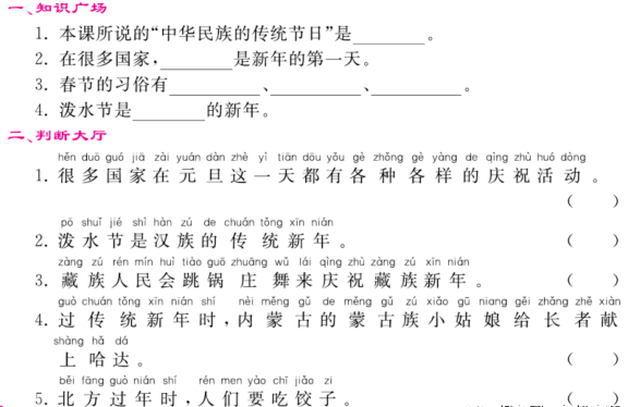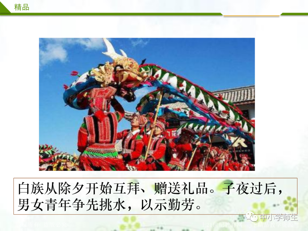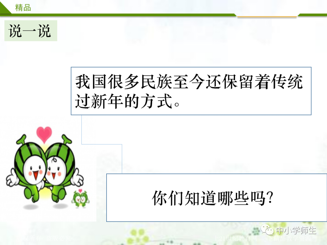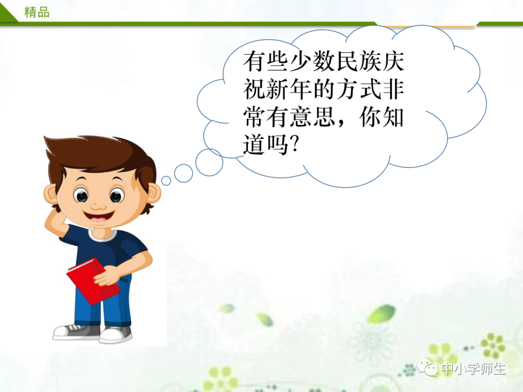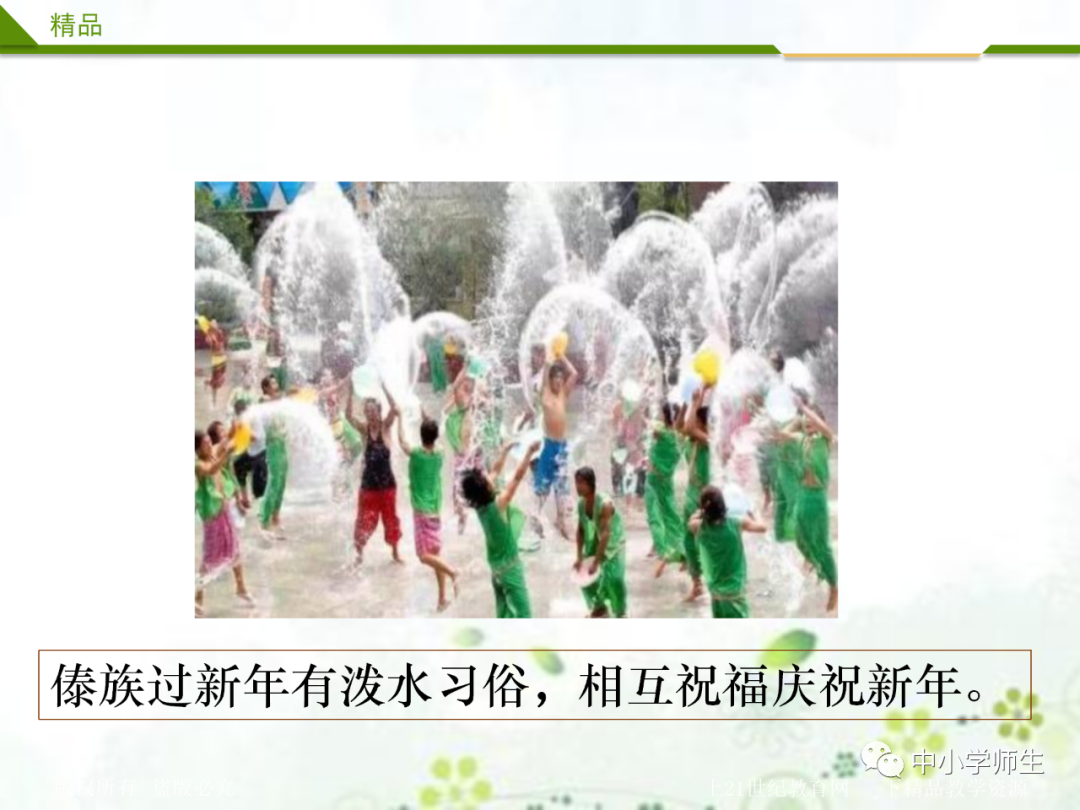2同学把自己查到的资料说给大家听,老师补充。(泰国是每年四月过传统的新年,印度是在十月,埃及是在尼罗河涨水的时候过新年,我国的新疆地区的少数民族是在十月或六月过新年。)