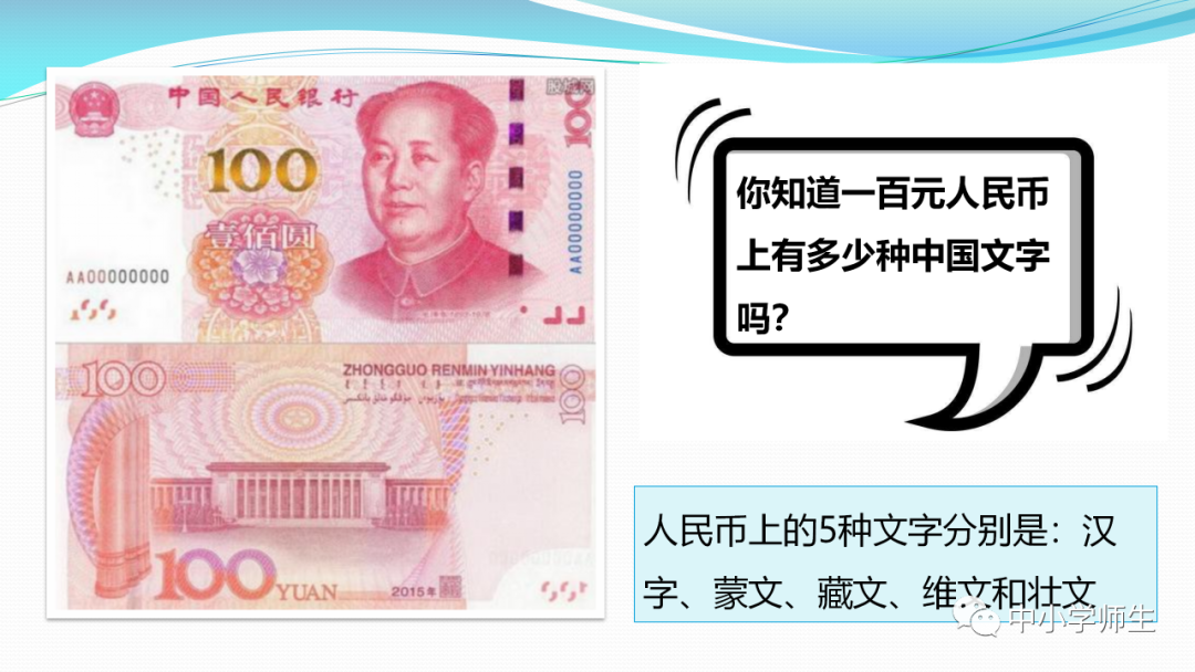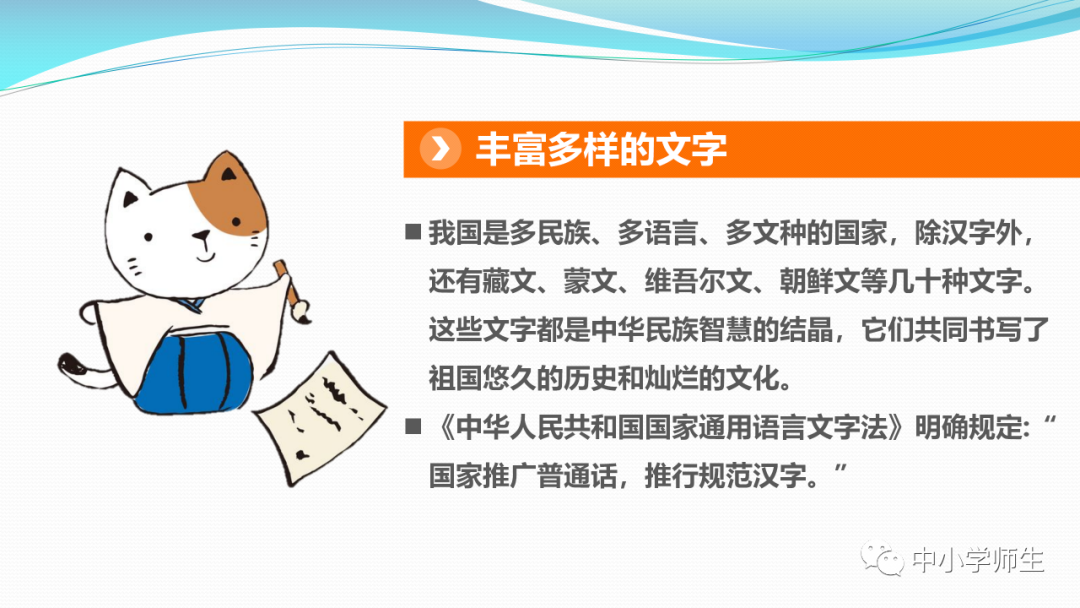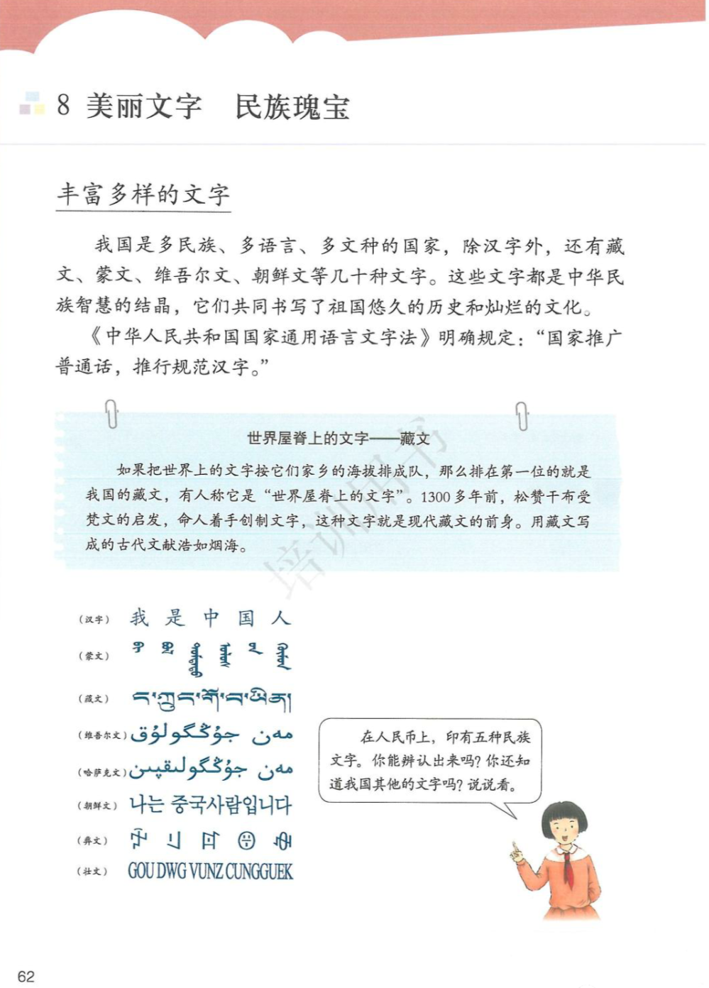 小结: 我国是多民族、多语言、多文种的国家,除汉字外,还有藏