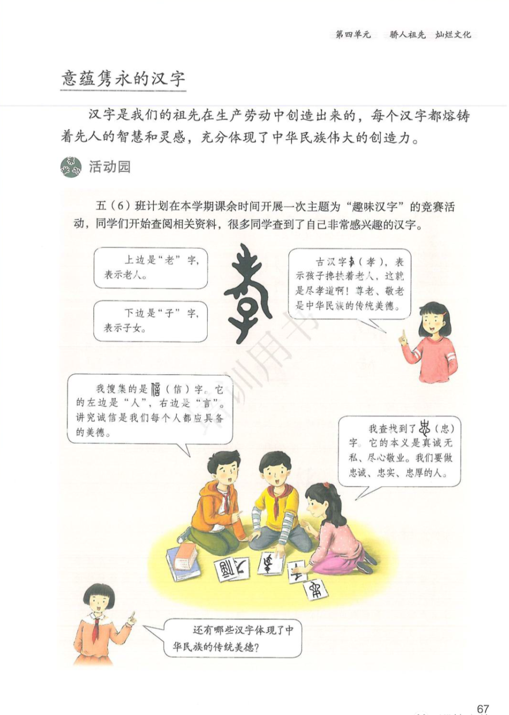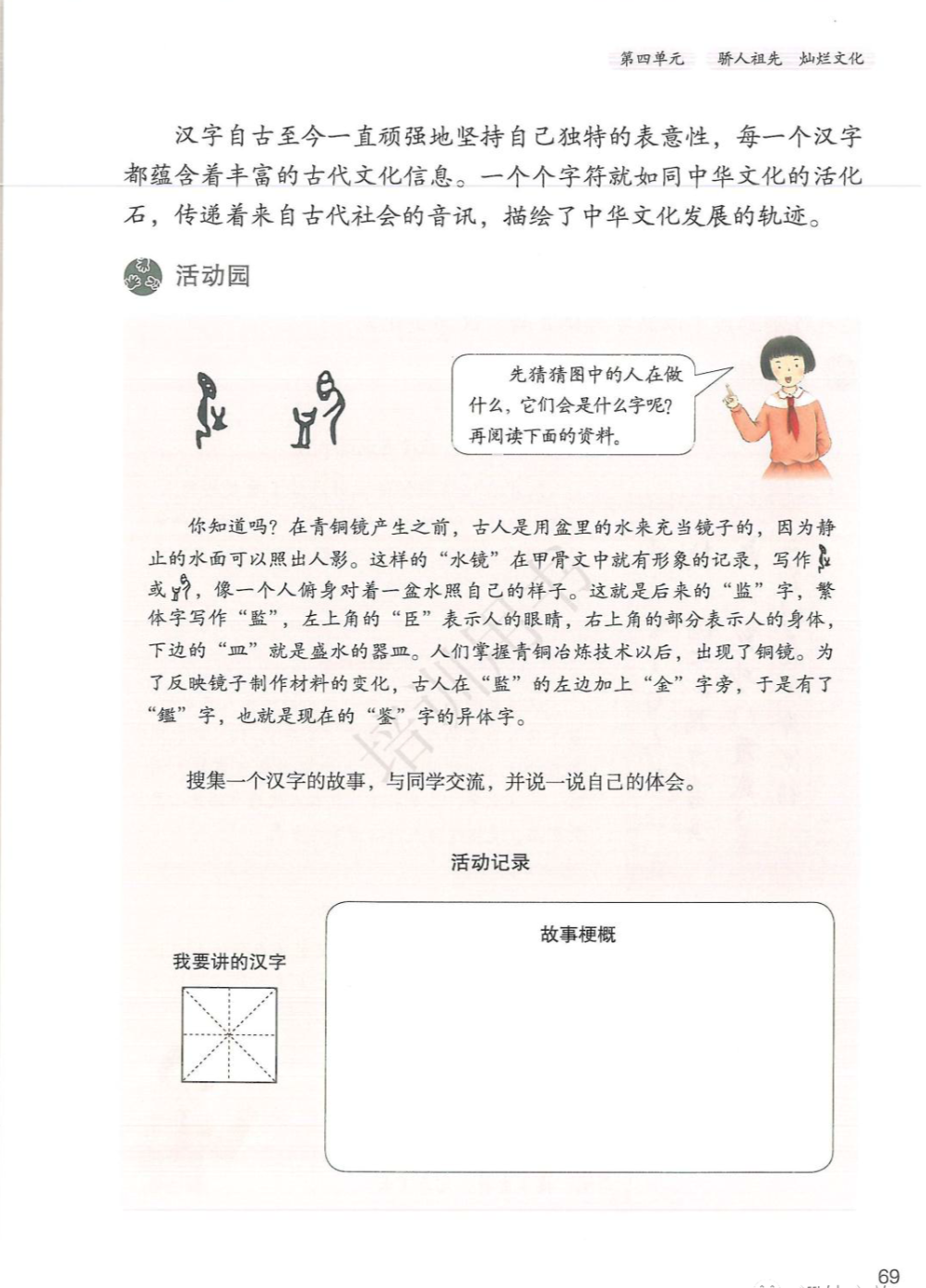 ①知道汉字熔铸着祖先的智慧和灵感,承载着中华民族的传统文化。