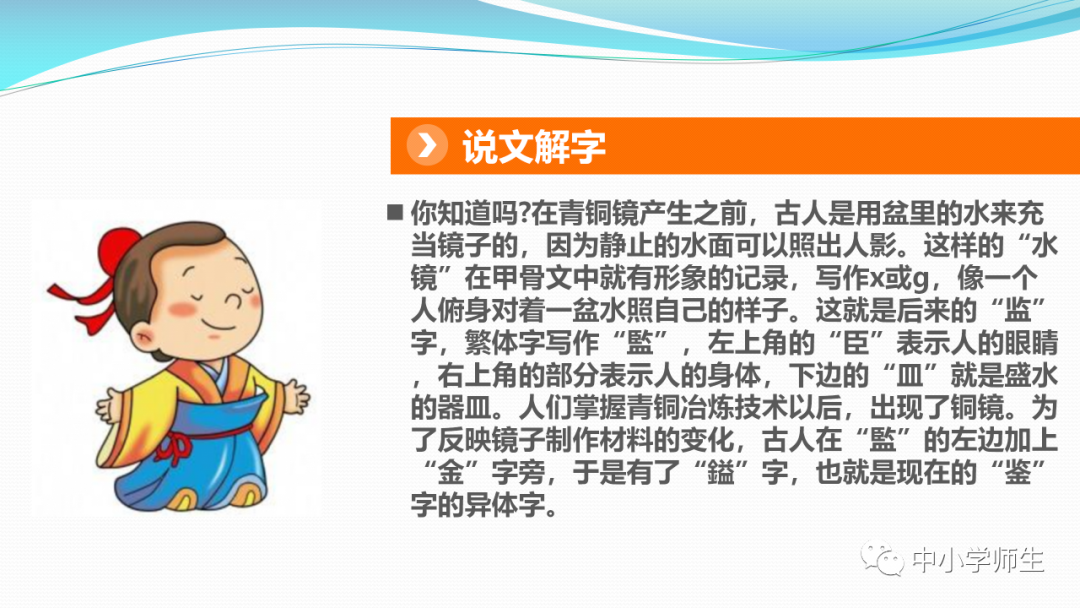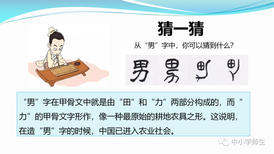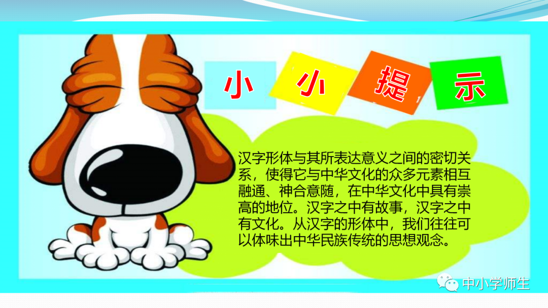 小结: 汉字是我们的祖先在生产劳动中创造出来的,每个汉字都熔铸着先人的智慧和灵感,充分体现了中华民族伟大的创造力。