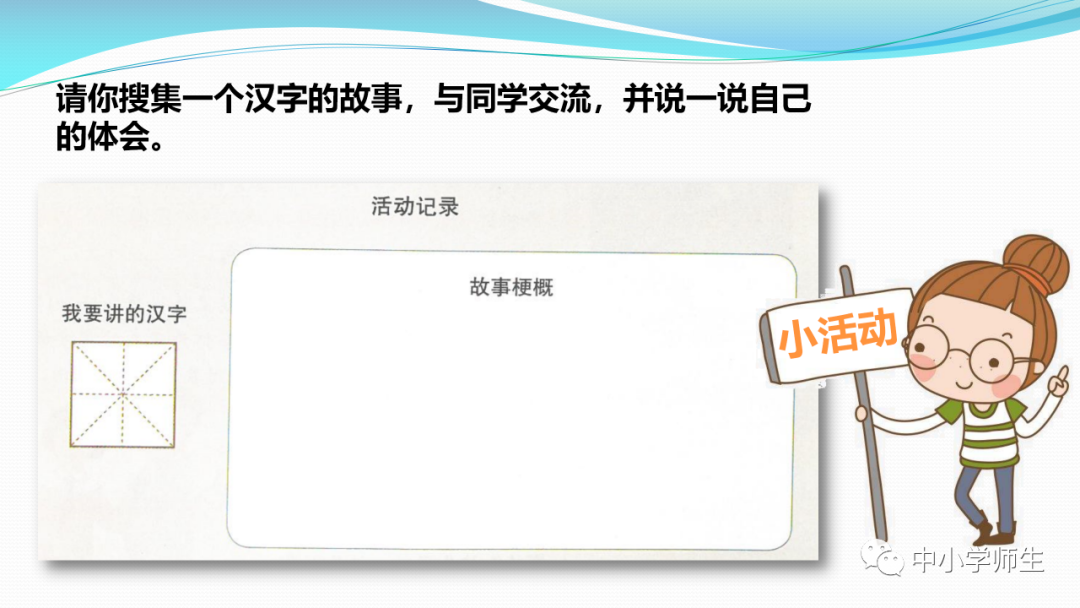 ②搜集汉字小故事,与同学交流,并说说自己的体会。