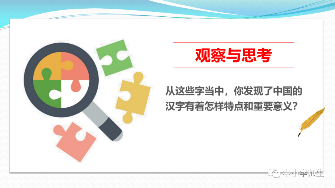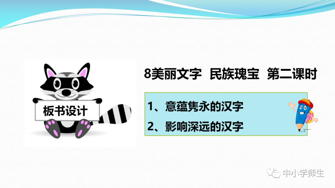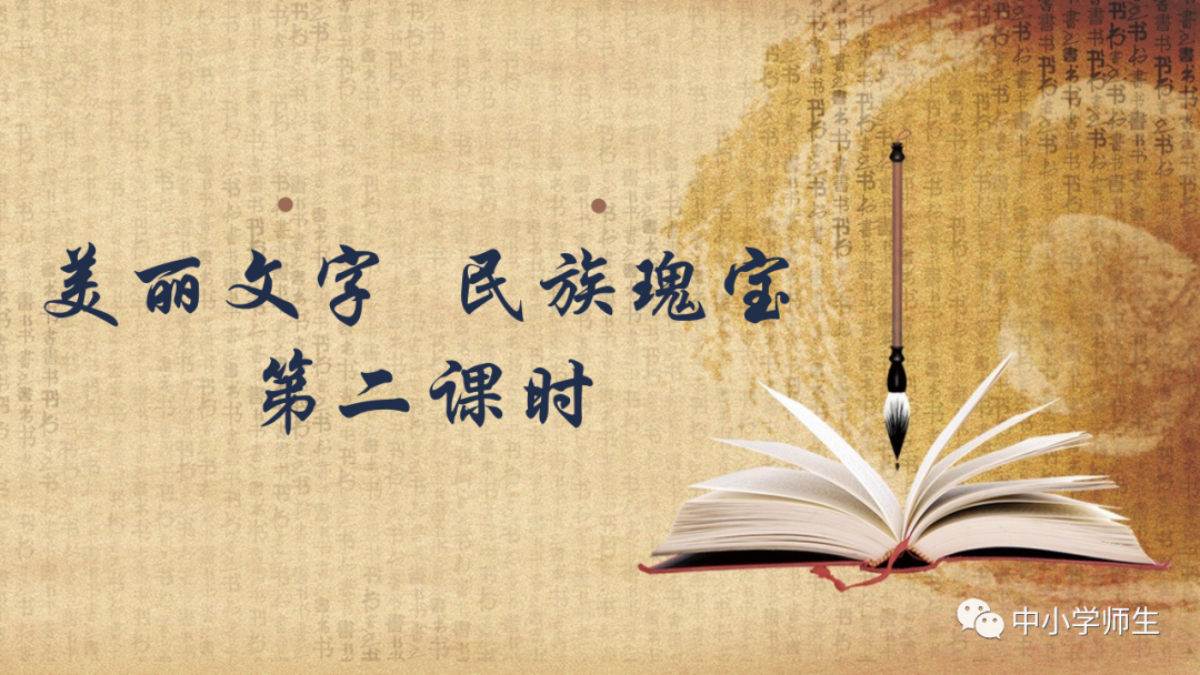 (2)今天我们继续学习第四单元的第8课《美丽文字 民族瑰宝》。通过本课学习,同学们至少要达到以下两个目标:1.知道汉字熔铸着祖先的智慧和灵感,承载着中华民族的传统文化。