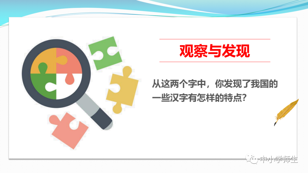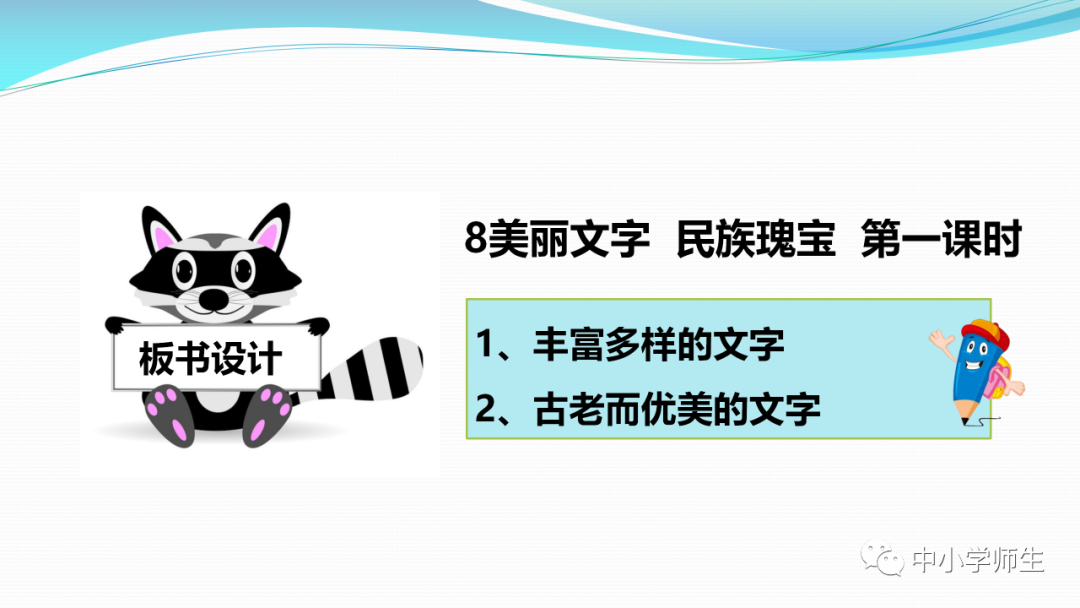 (2)今天我们来学习第四单元的第8课《美丽文字 民族瑰宝》。通过本课学习,同学们至少要达到以下两个目标:1.了解中华民族语言文字的多样性。