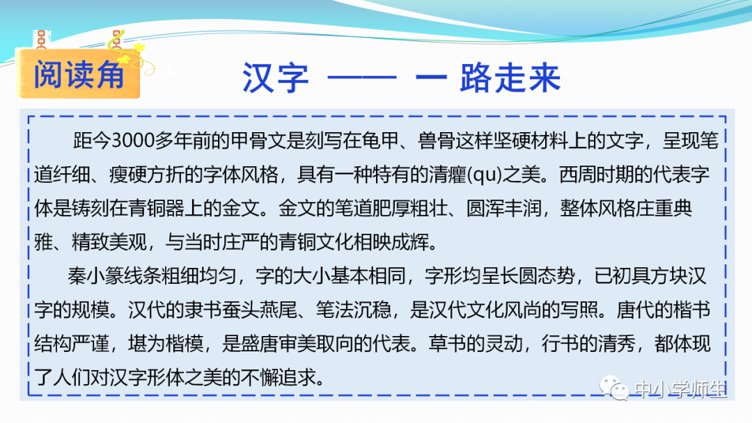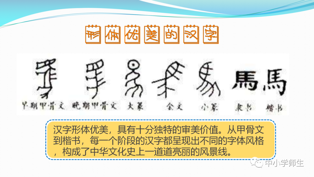 小结: 汉字形体优美,具有十分独特的审美价值。从甲骨文到书,每一个阶段的汉字都呈现出不同的字体风格,构成了中华文化史上一道道亮丽的风景线。