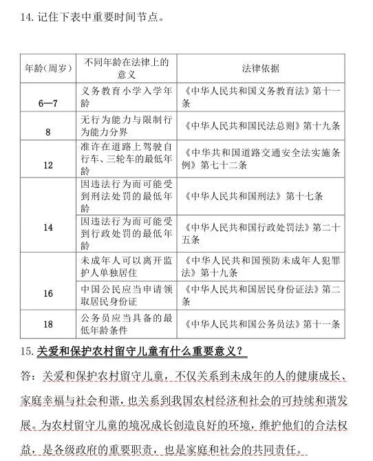 2、很多法律规定都涉及具体的年龄节点,比如,准许在道路上驾驶自行车、三轮车的最低年龄是( )周岁,公务员应当具备的最低年龄是( )周岁。