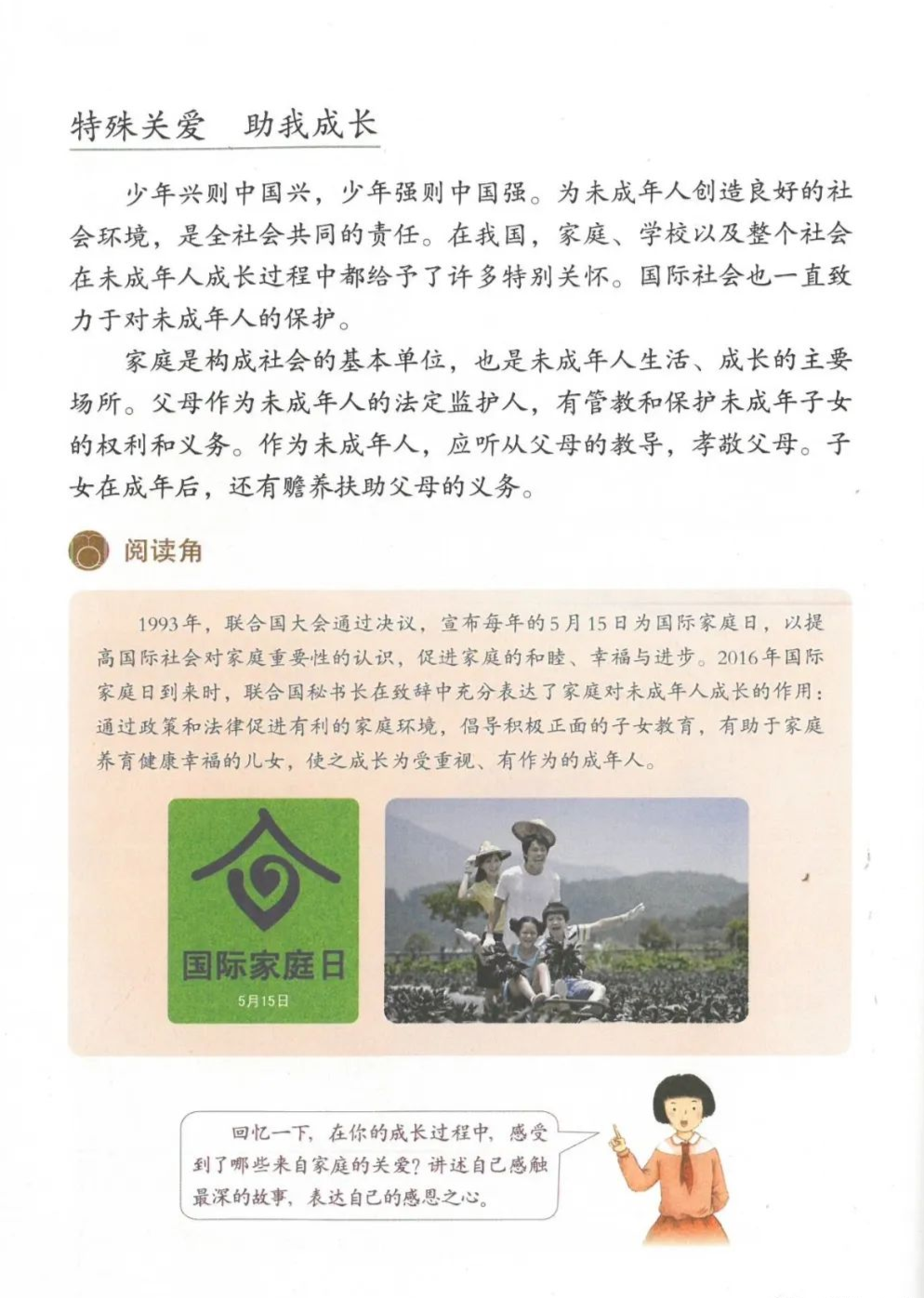 3、通过现实生活中发生的家庭、学校、社会的案例资料,感受家庭、学校、社会给予特殊保护,体会今天我们受到法律特殊保护的幸福。