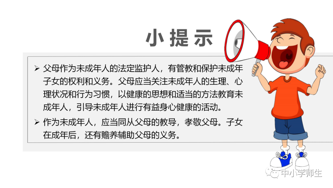 11.(家庭)是构成社会的基本单位,也是未成年人生活成长的主要场所。父母作为未成年人的法定监护人,有管教和保护未成年人子女的(权利)和(义务)。
