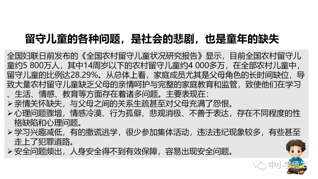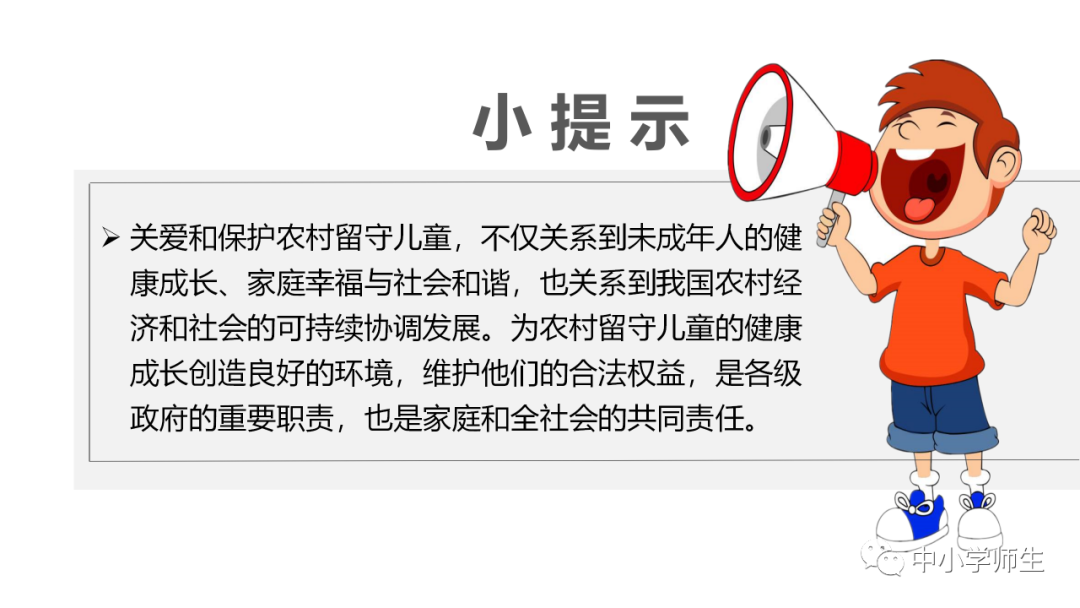 调查了解身边的留守儿童在现实生活中存在哪些问题?需要我们给予哪些保护?请同学们提出合理化的建议。