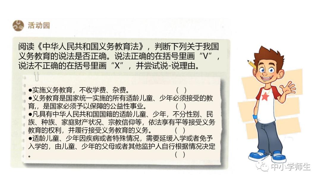 5.《中华人民共和国义务教育法》是我国为了保障适龄儿童、少年接受(义务教育)的权利,保证义务教育的实施,提高全民族素质而制定的法律,于(1986)年通过。