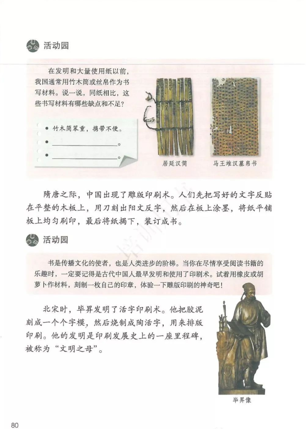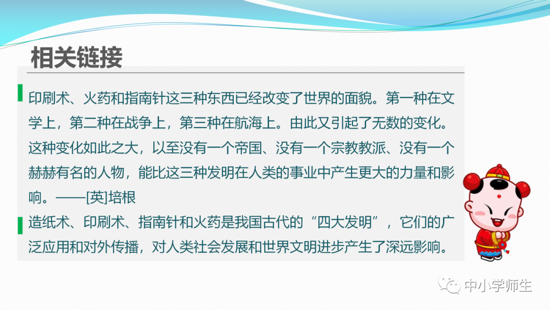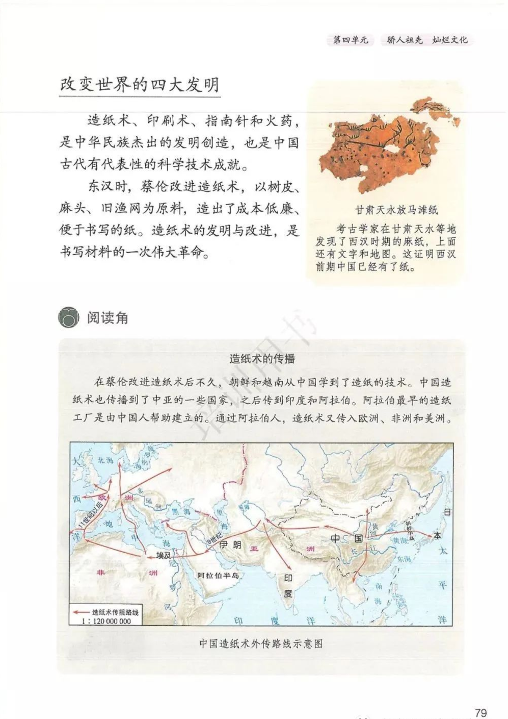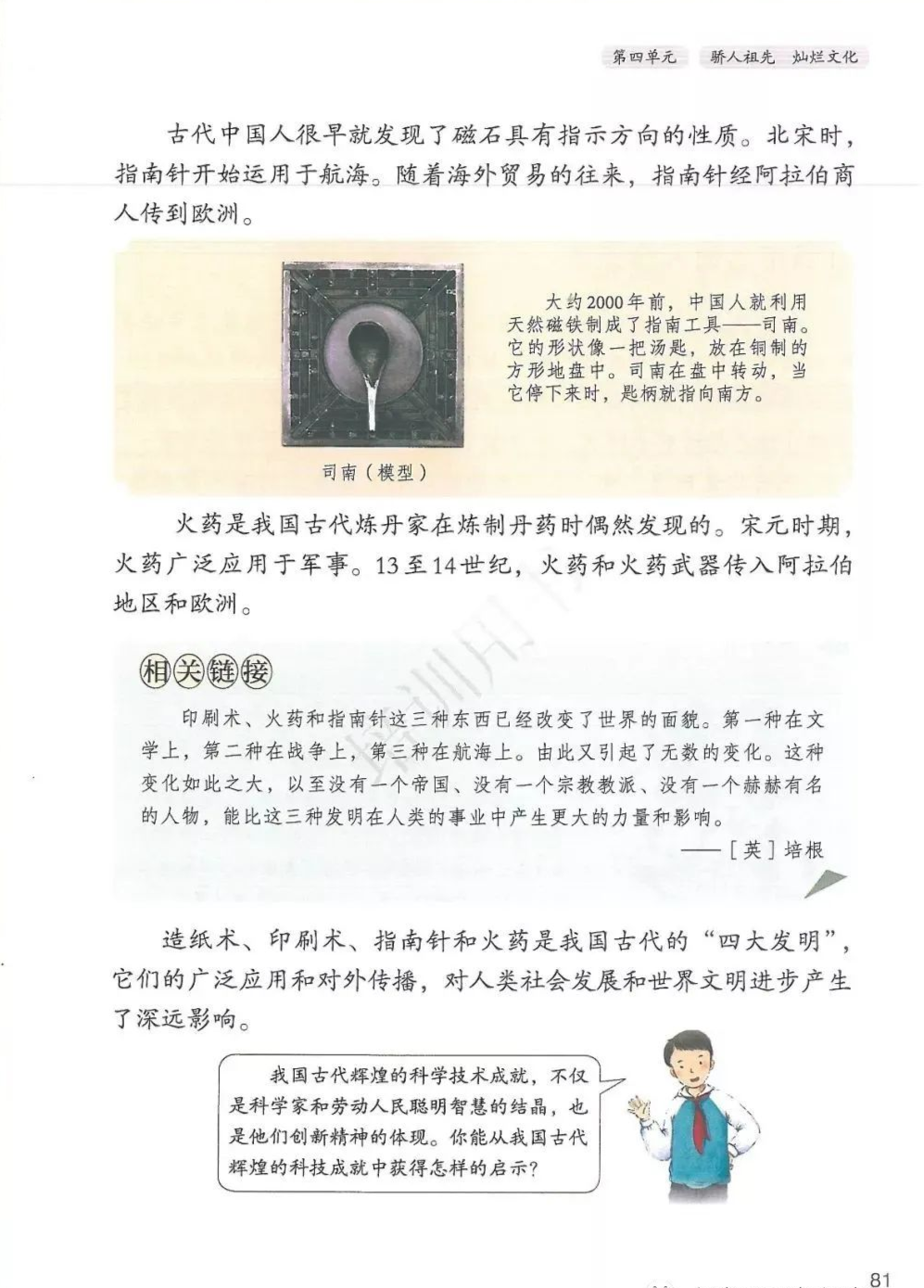 ②了解我国的四大发明对人类社会发展和世界文明进步产生的深远影响和巨大贡献。