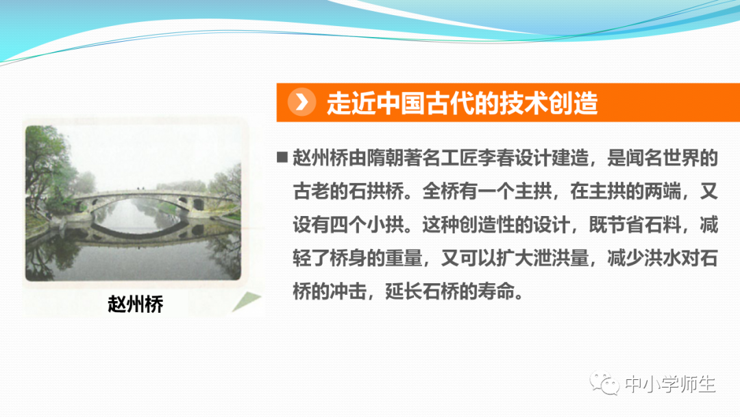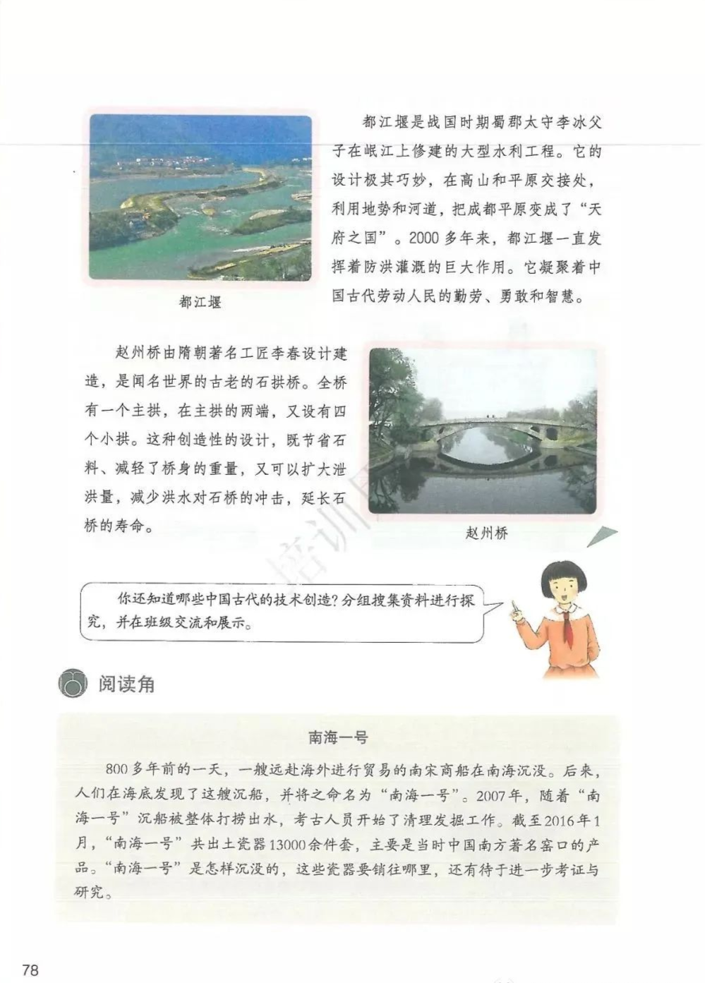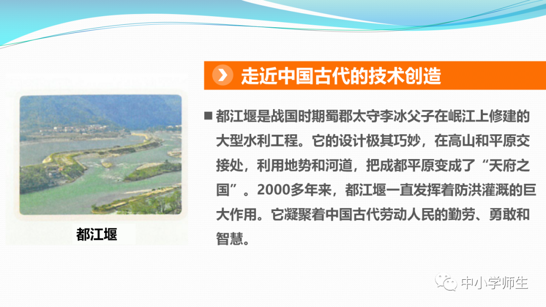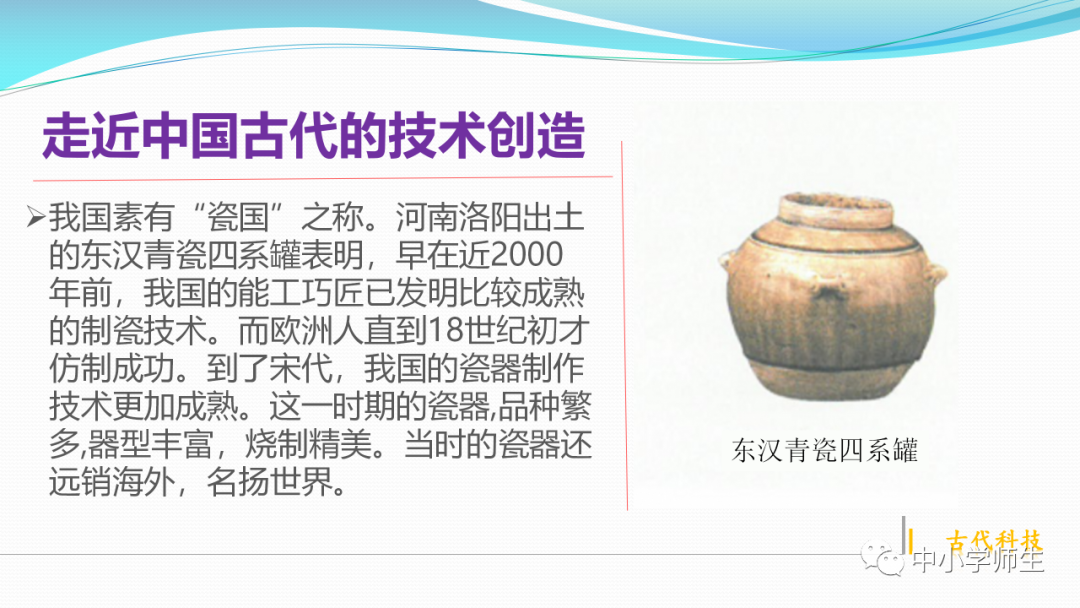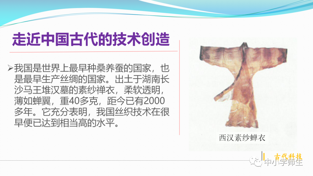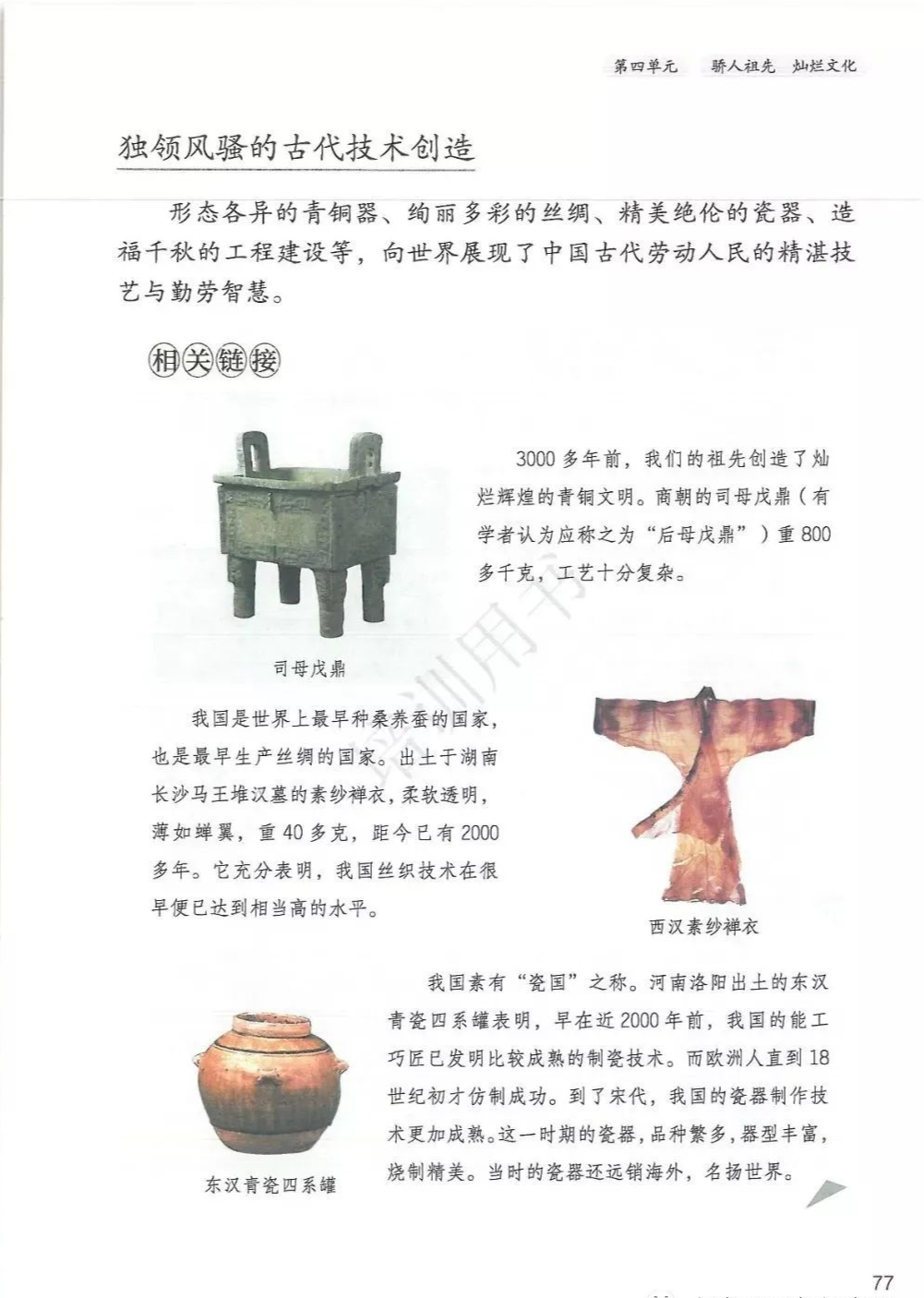 司母戊鼎、西汉素纱禅衣、东汉青瓷四系罐、都江宴、赵州桥等图片,从青铜器、丝绸、瓷器等方面感受我国古代领先世界的技术创造,并交流和展示自己搜集的资料。