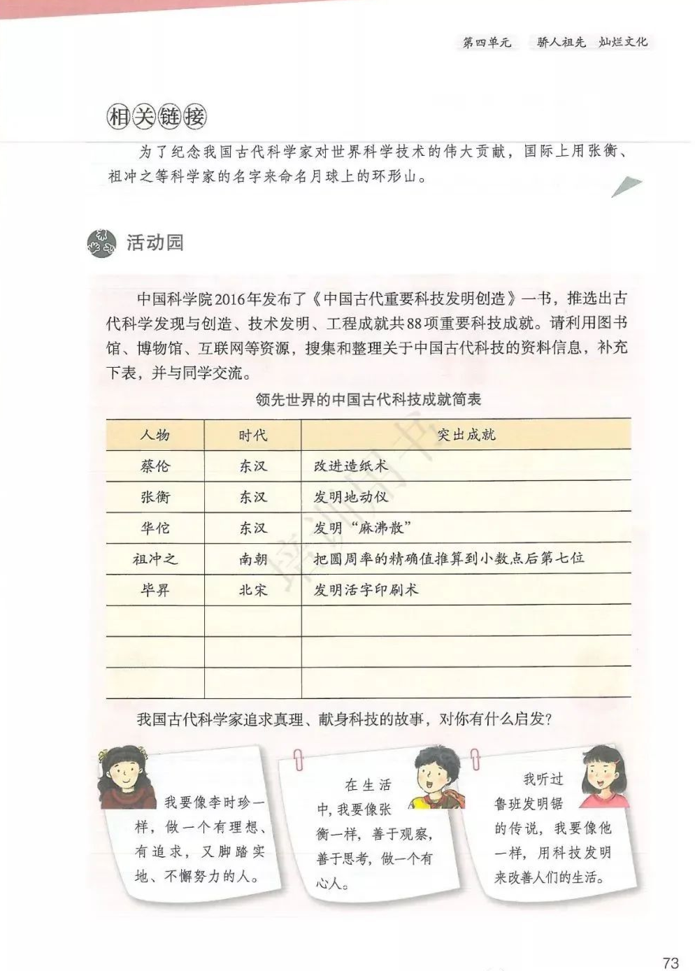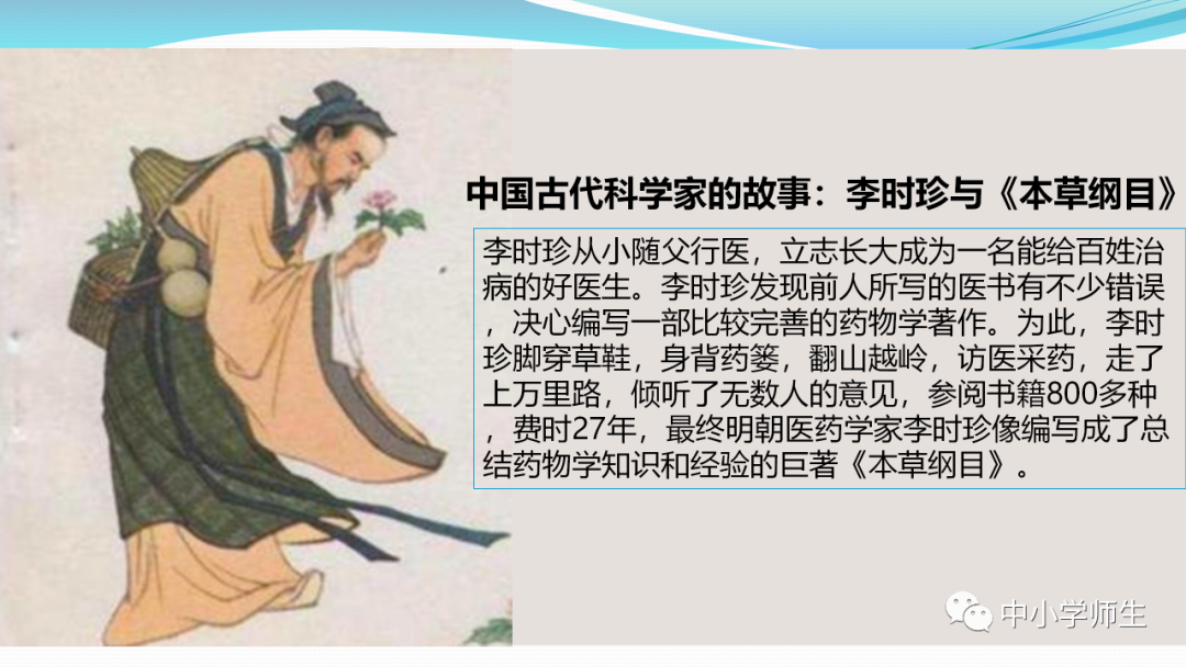 课件出示张衡、祖冲之、李时珍的头像,了解他们的科学发明故事,学习他们刻苦专研、治病救人、追求真理的精神品质。