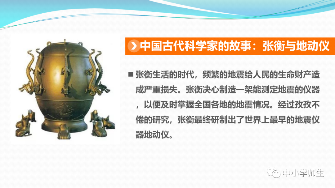 师:你了解张衡发明地动仪的故事吗?像张衡这样的古代科学家还有很多,让我们一起走近他们,了解他们的故事。