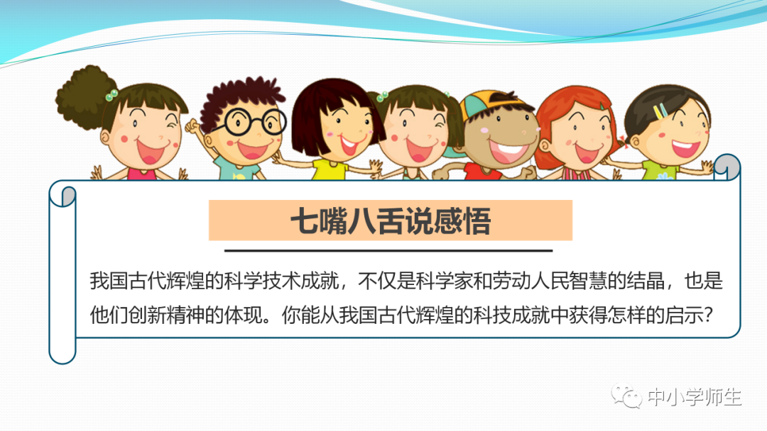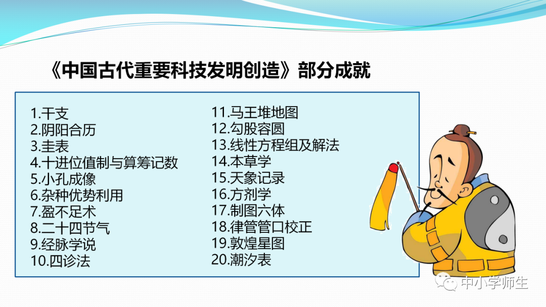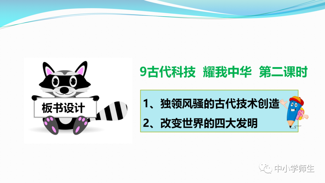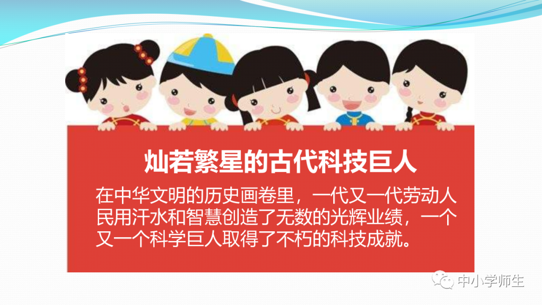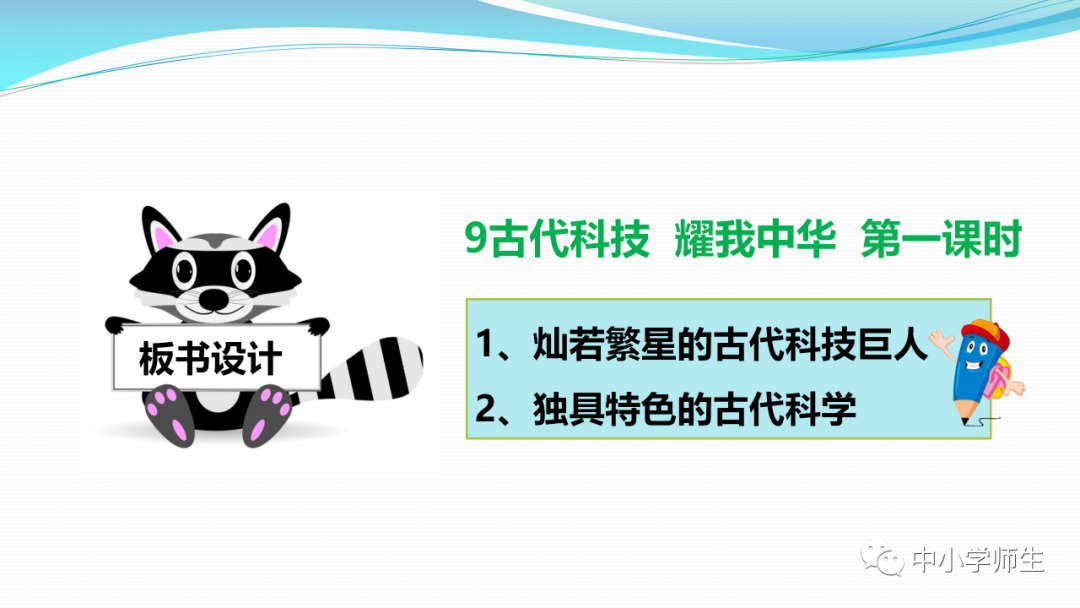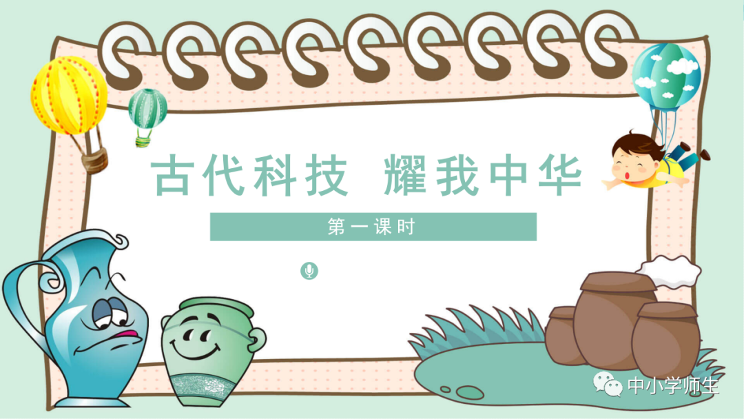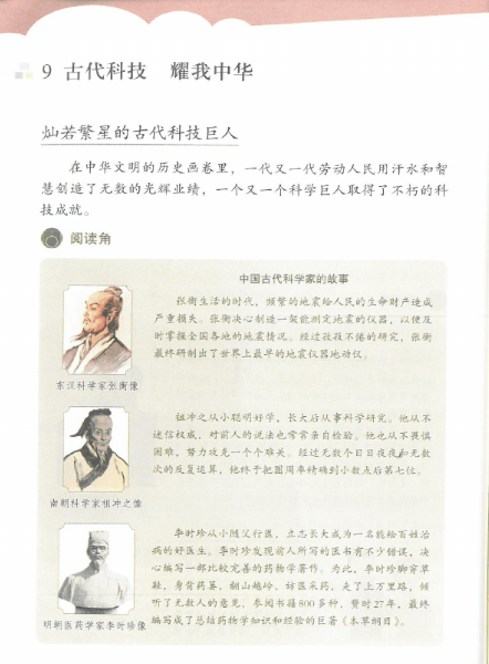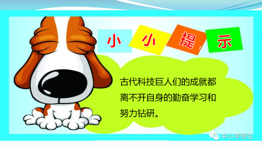 2.今天就让我们来学习第四单元的第9课《古代科技 耀我中华》通过本课学习,同学们至少要达到以下两个目标:①了解我国古代科学家的故事。
