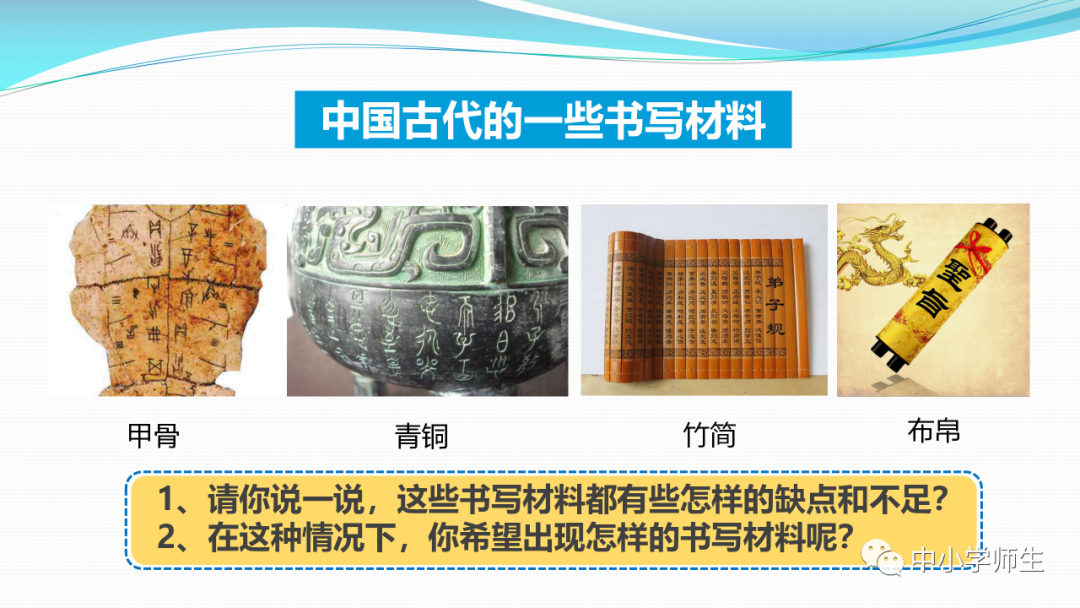 师:是谁改进了造纸术?在发明和大量使用纸以前的书写材料同纸相比,有哪些缺点和不足?