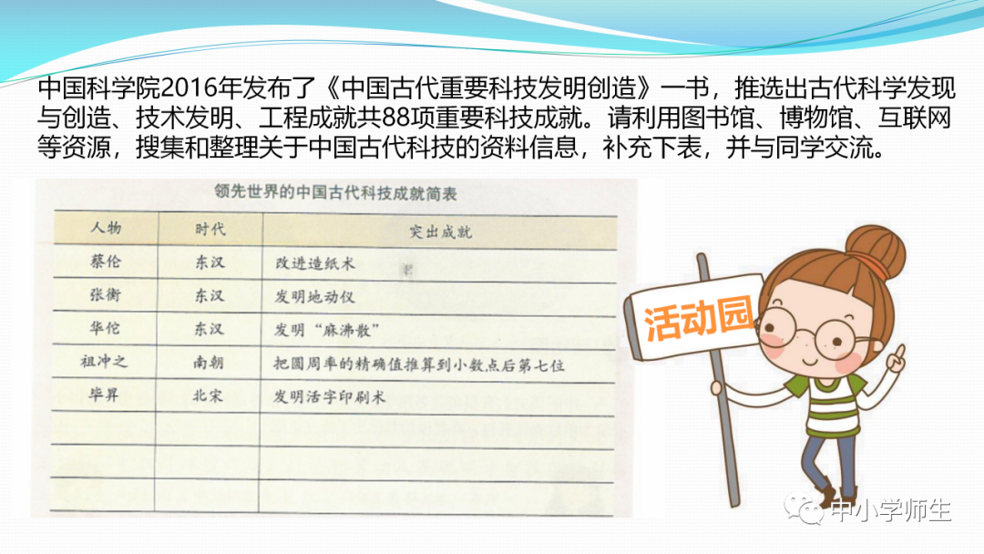 让学生写出自己搜集的古代科学家是谁?生活在什么朝代?