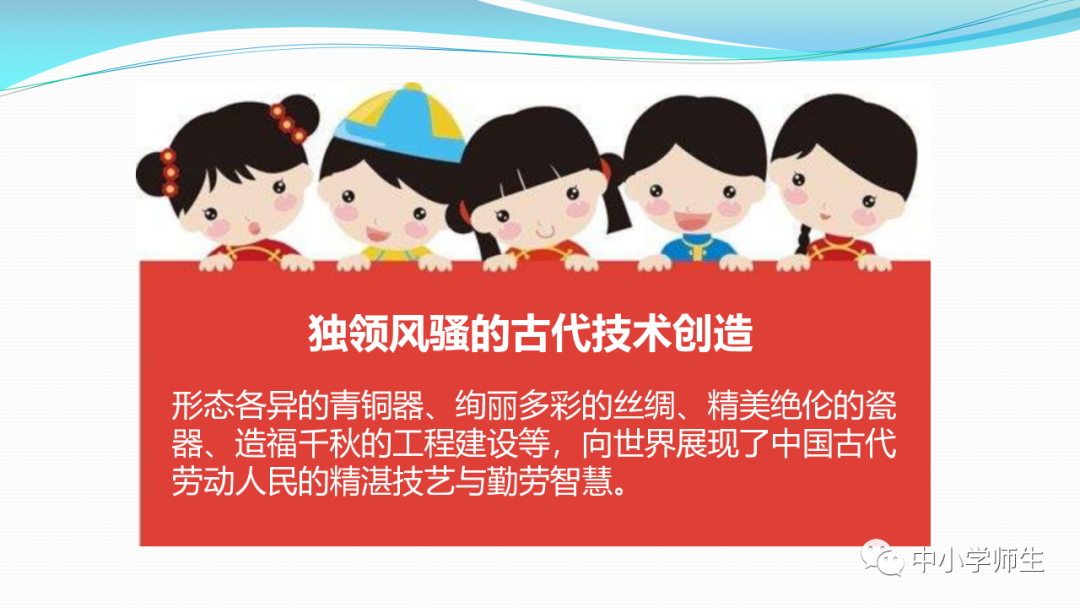 小结: 形态各异的青铜器、绚丽多彩的丝绸、精美绝伦的瓷器、造福千秋的工程建设等,向世界展现了中国古代劳动人民的精湛技艺与勤劳智慧。