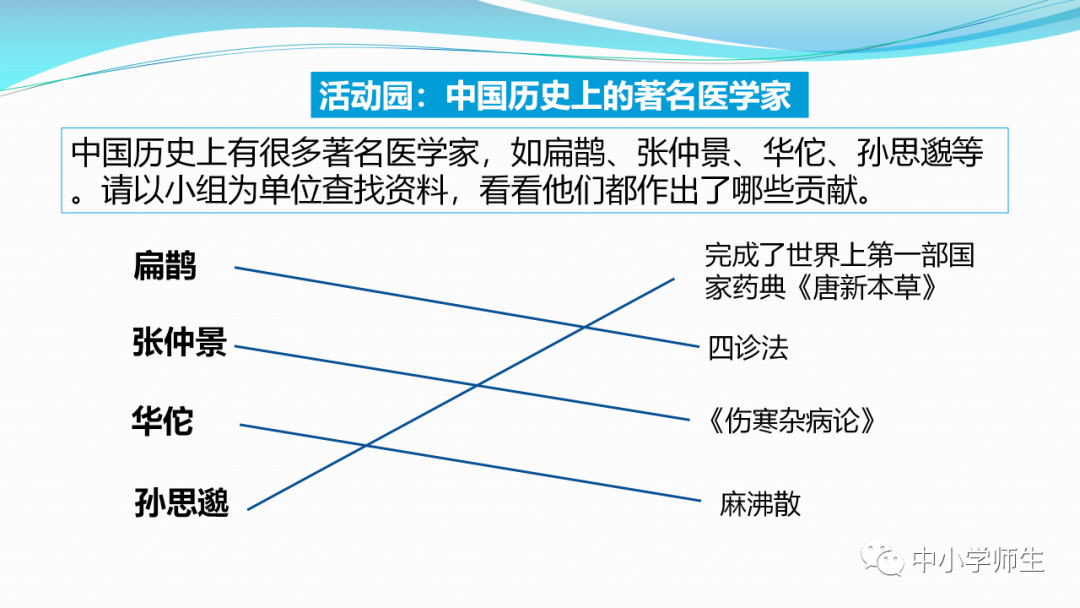 教师补充资料:张仲景,东汉末年著名医学家,被称为医圣。相传曾举孝廉,做过长沙太守,所以有张长沙之称。张仲景广泛收集医方,写出了传世巨著《伤寒杂病论》。它确立的辨证论治原则,是中医临床的基本原则,是中医的灵魂所在。在方剂学方面,《伤寒杂病论》也做出了巨大贡献,创造了很多剂型,记载了大量有效的方剂。其所确立的六经辨证的治疗原则,受到历代医学家的推崇。这是中国第一部从理论到实践、确立辨证论治法则的医学专著,是中国医学史上影响最大的著作之一,是后学者研习中医必备的经典著作,广泛受到医学生和临床大夫的重视。