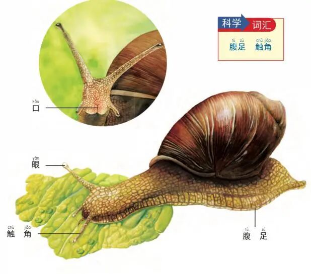 蜗牛的身体结构有:口、眼、触角和腹足。蜗牛的特点:喜欢生活在阴暗潮湿的草丛里,喜欢吃青菜和嫩茎,有两对触角,一对眼睛,用腹足运动。